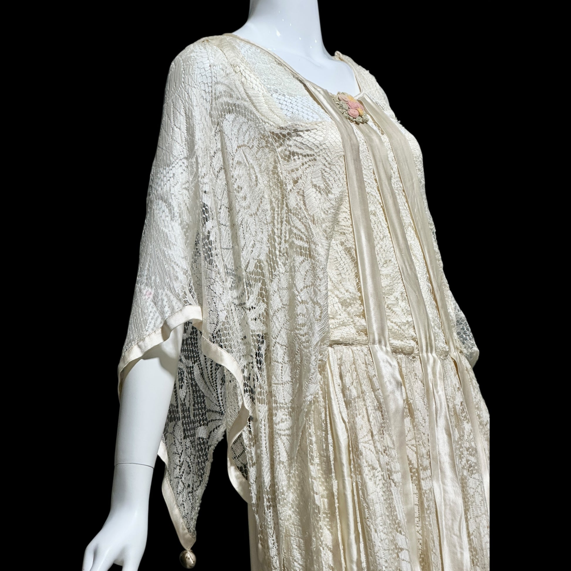 1920s Antique vintage wedding dress, Handmade candlelight white silk and lace slip dress with scarf sleeves, bridal flapper dress