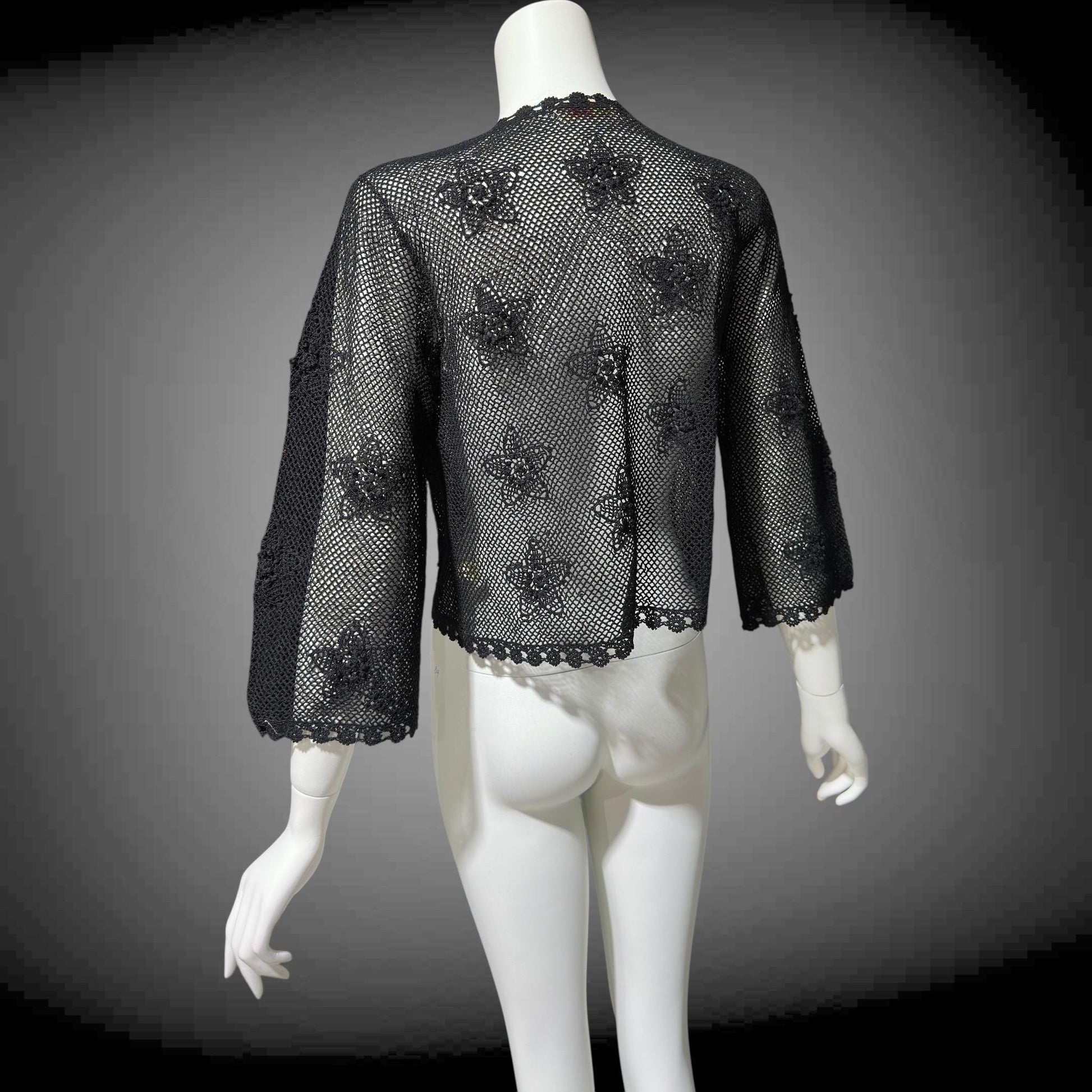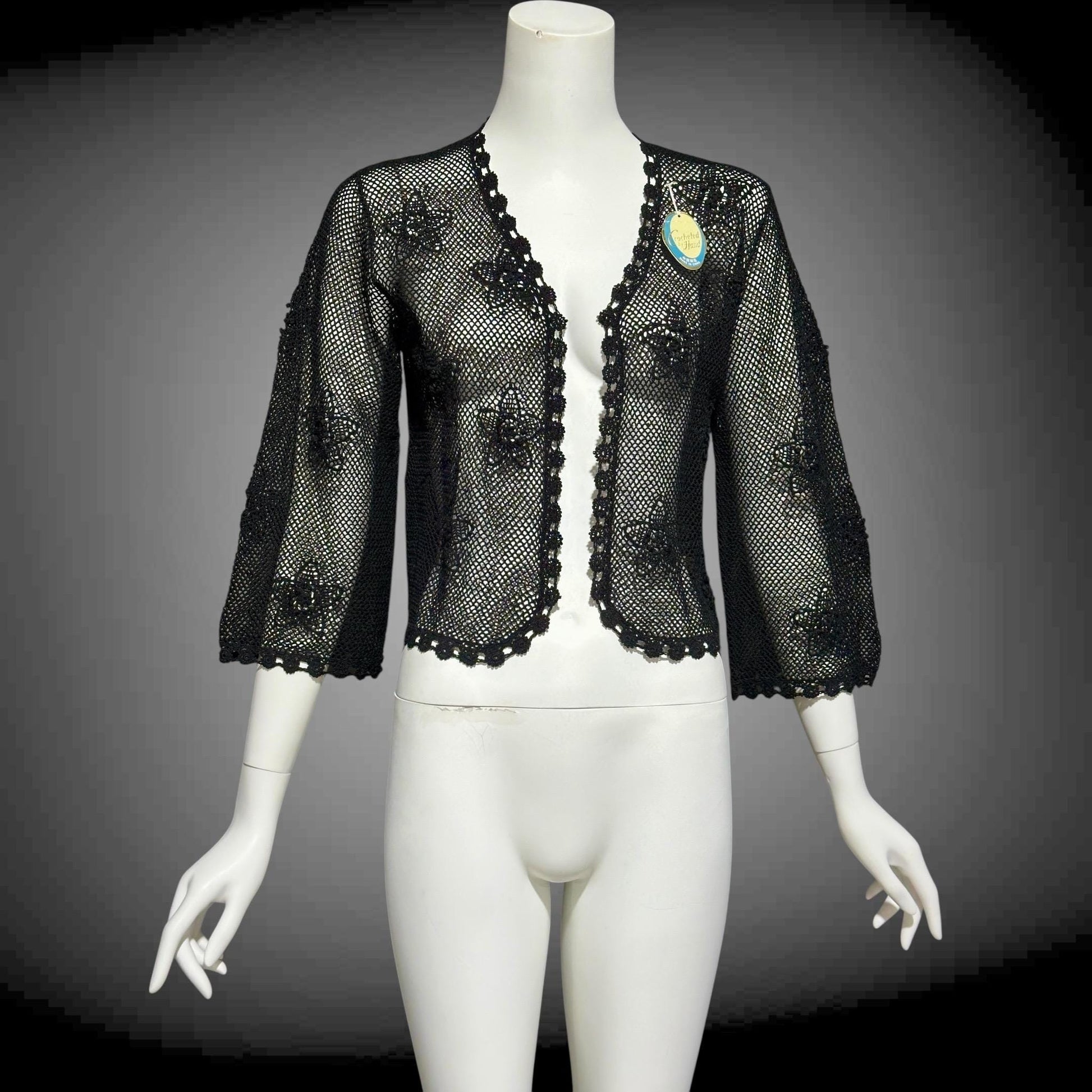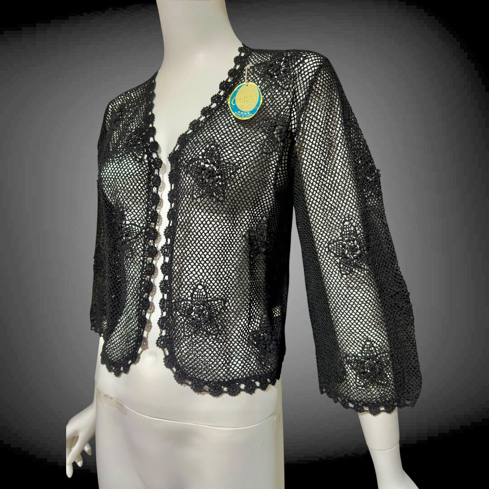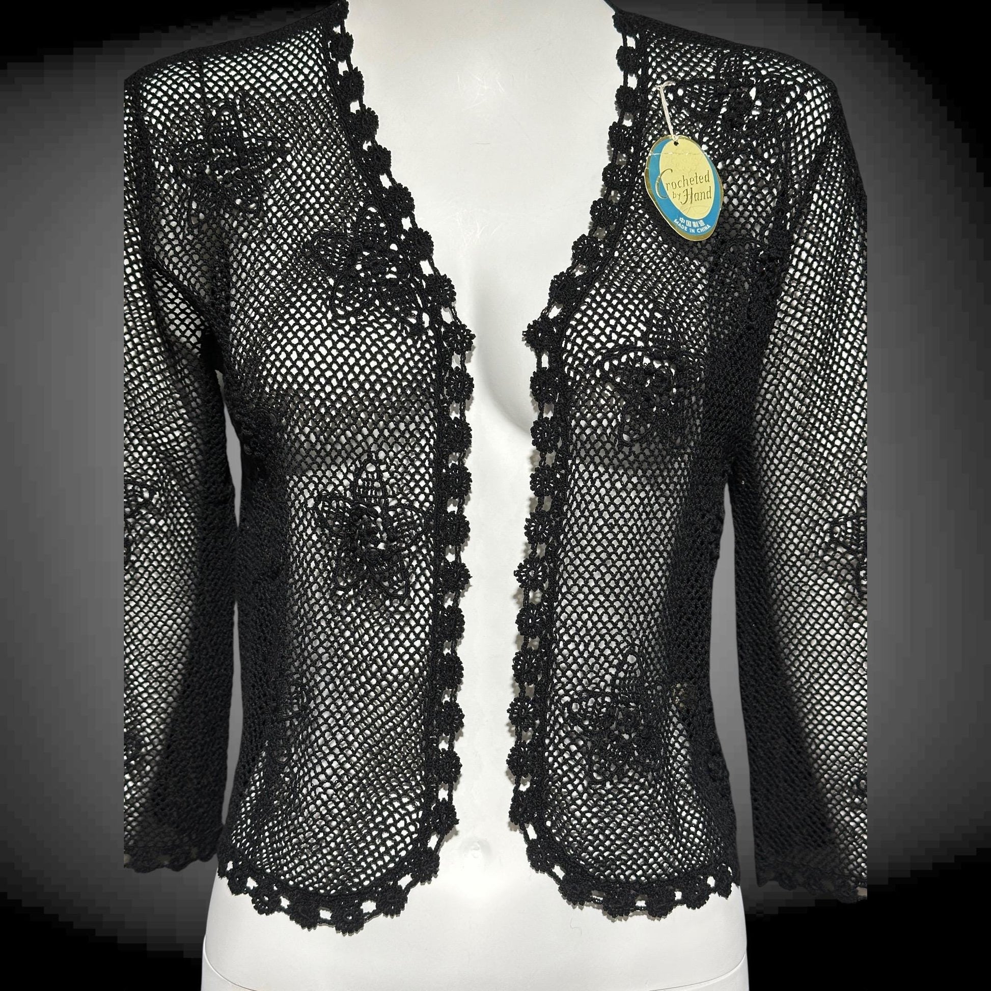 1950s vintage crochet cardigan, black 100% cotton Hand Made Shanghai cropped sweater