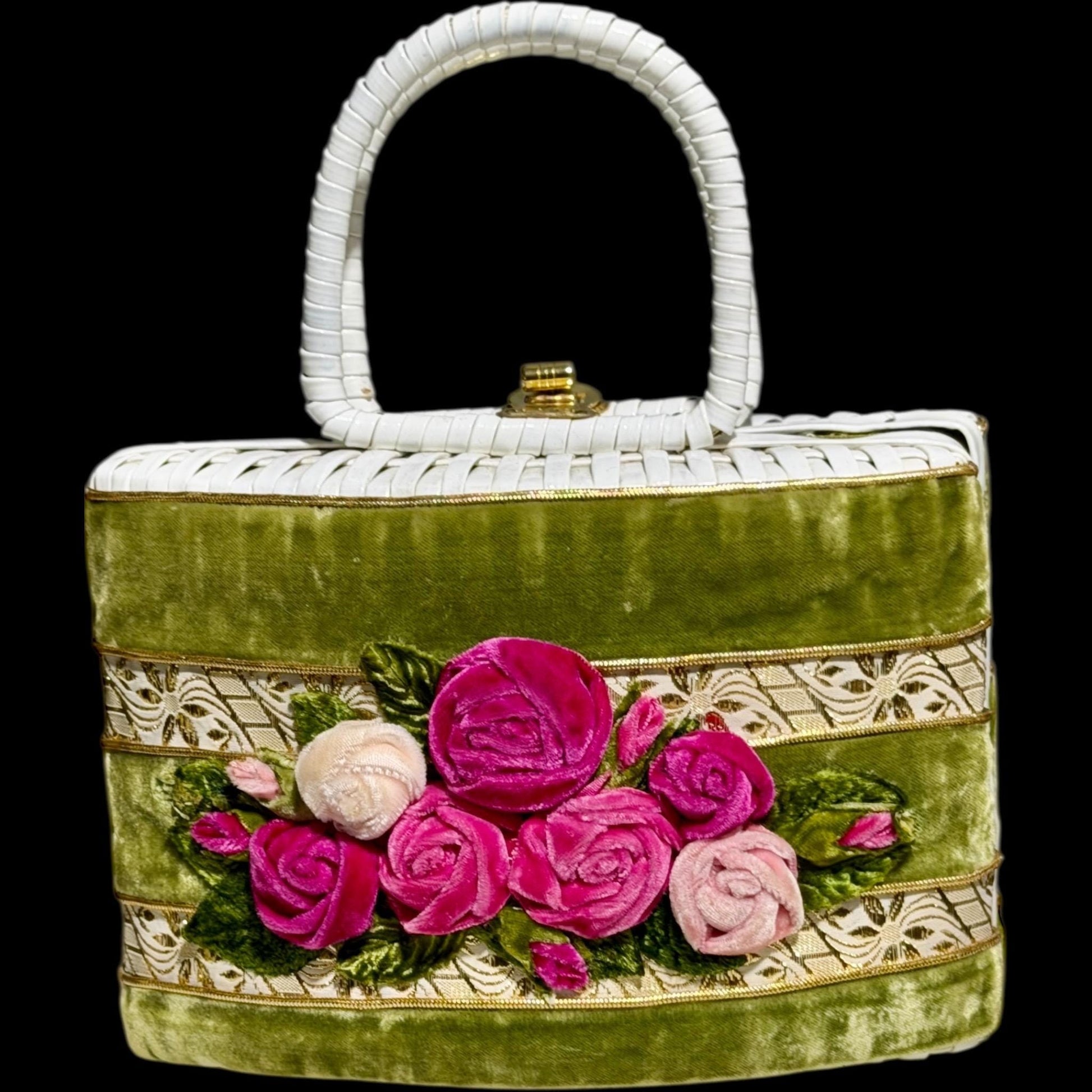 1950s vintage handbag purse, White straw with 3D velvet roses top handle basket purse