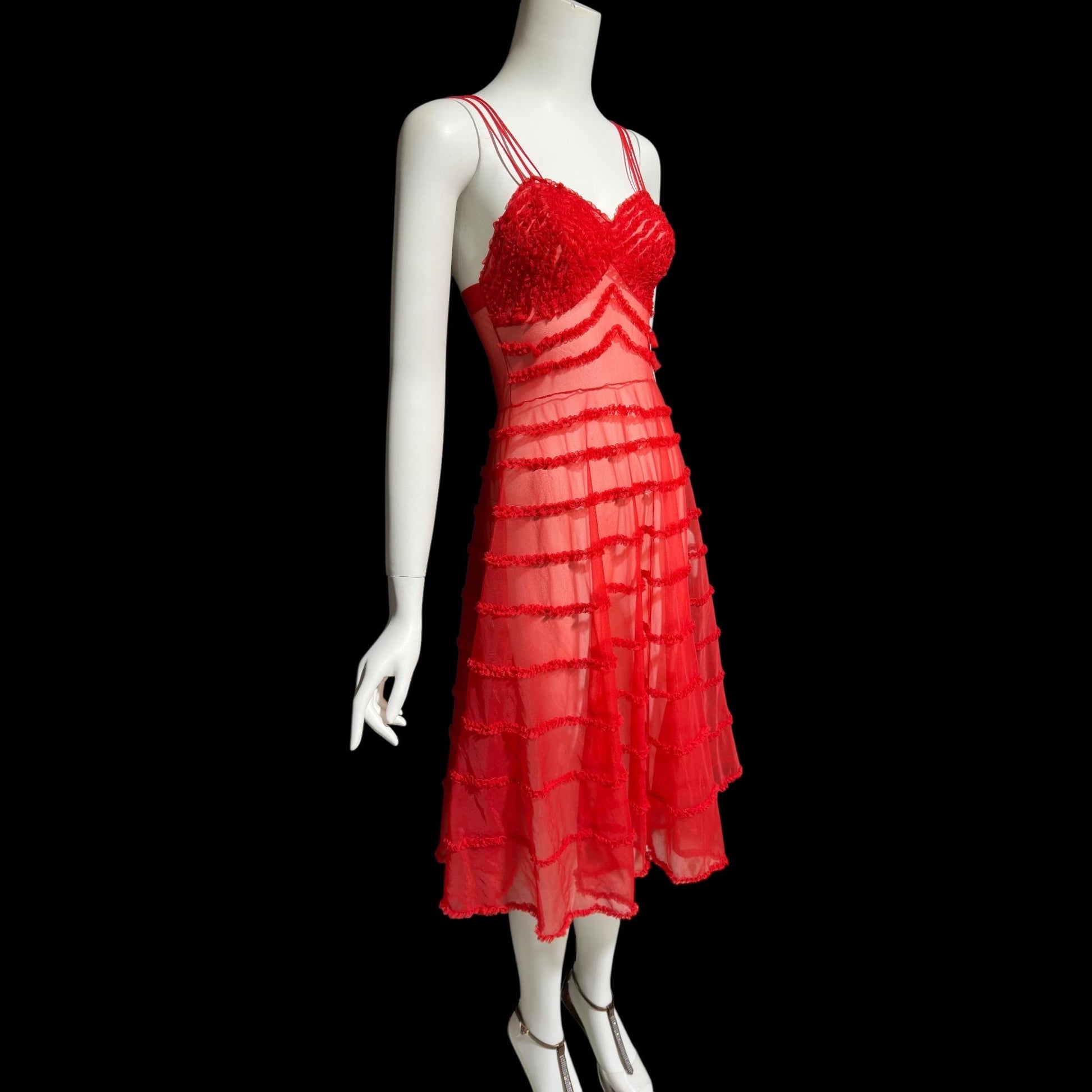 1950s vintage nightgown slip dress, sheer nylon lipstick red ruffled twirling night dress