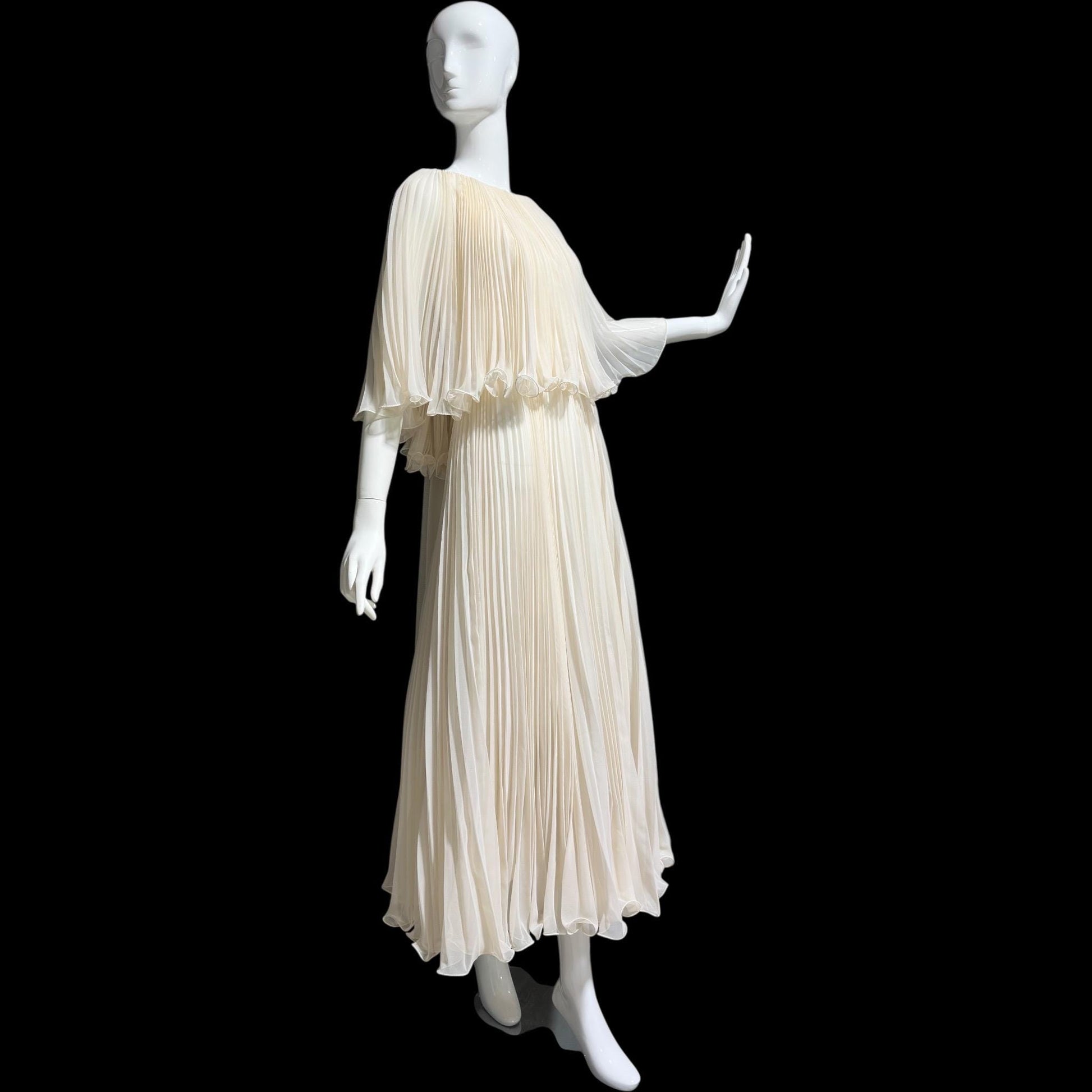 1960s vintage evening dress gown, almond white lace pleated dress, ruffled cape collar
