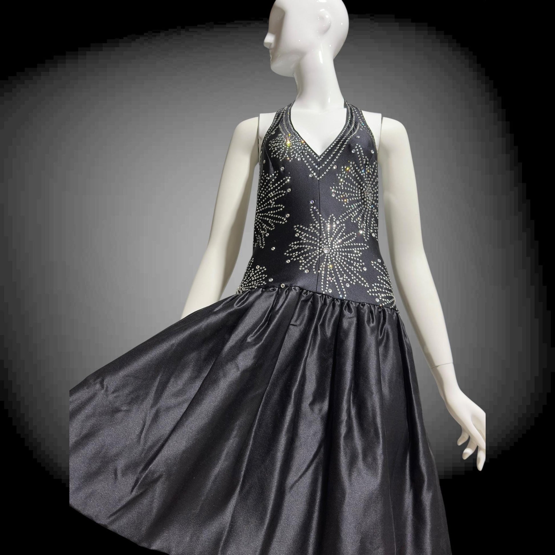 Fitted bodice is exquisitely adorned with prong set rhinestones and a halter neckline and a dropped waist.