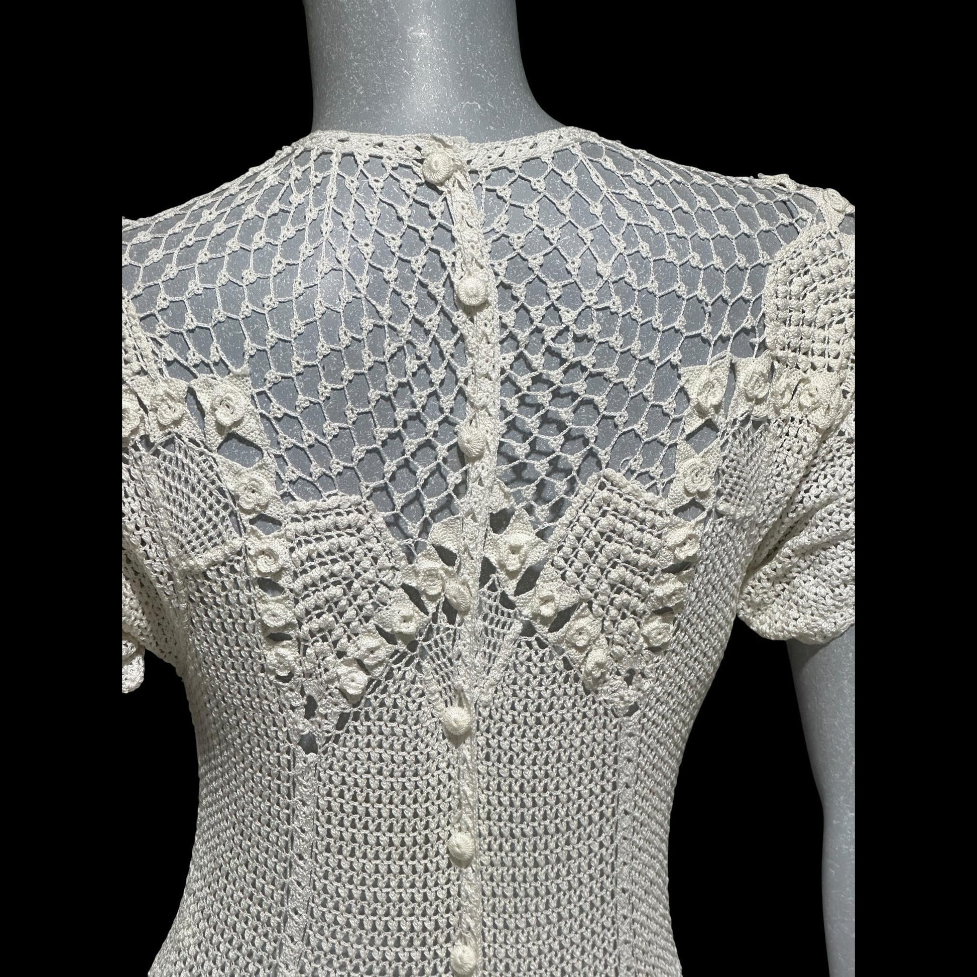 1970s vintage white crochet dress, all cotton blouson shirtdress, midi length