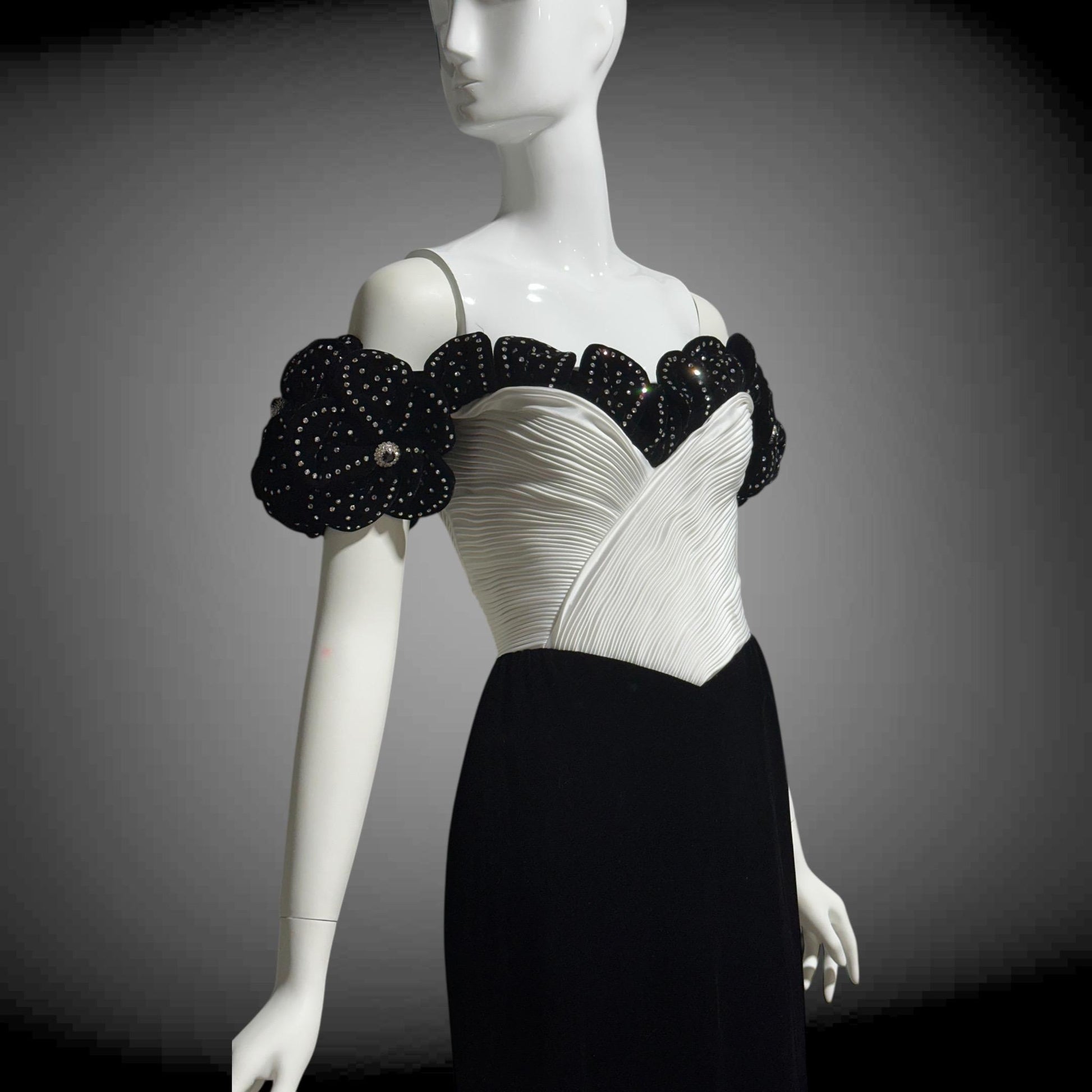 Black Velvet White Plisse and Rhinestones off shoulder gown