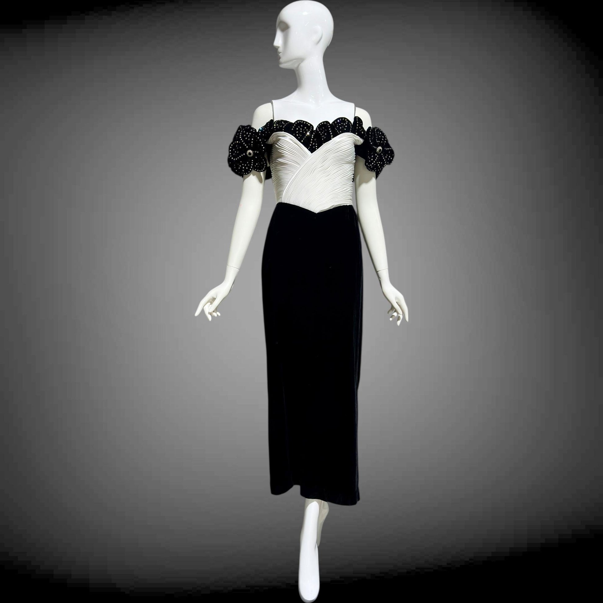 1980s Vintage evening dress gown, Black Velvet White Plisse and Rhinestones off shoulder gown