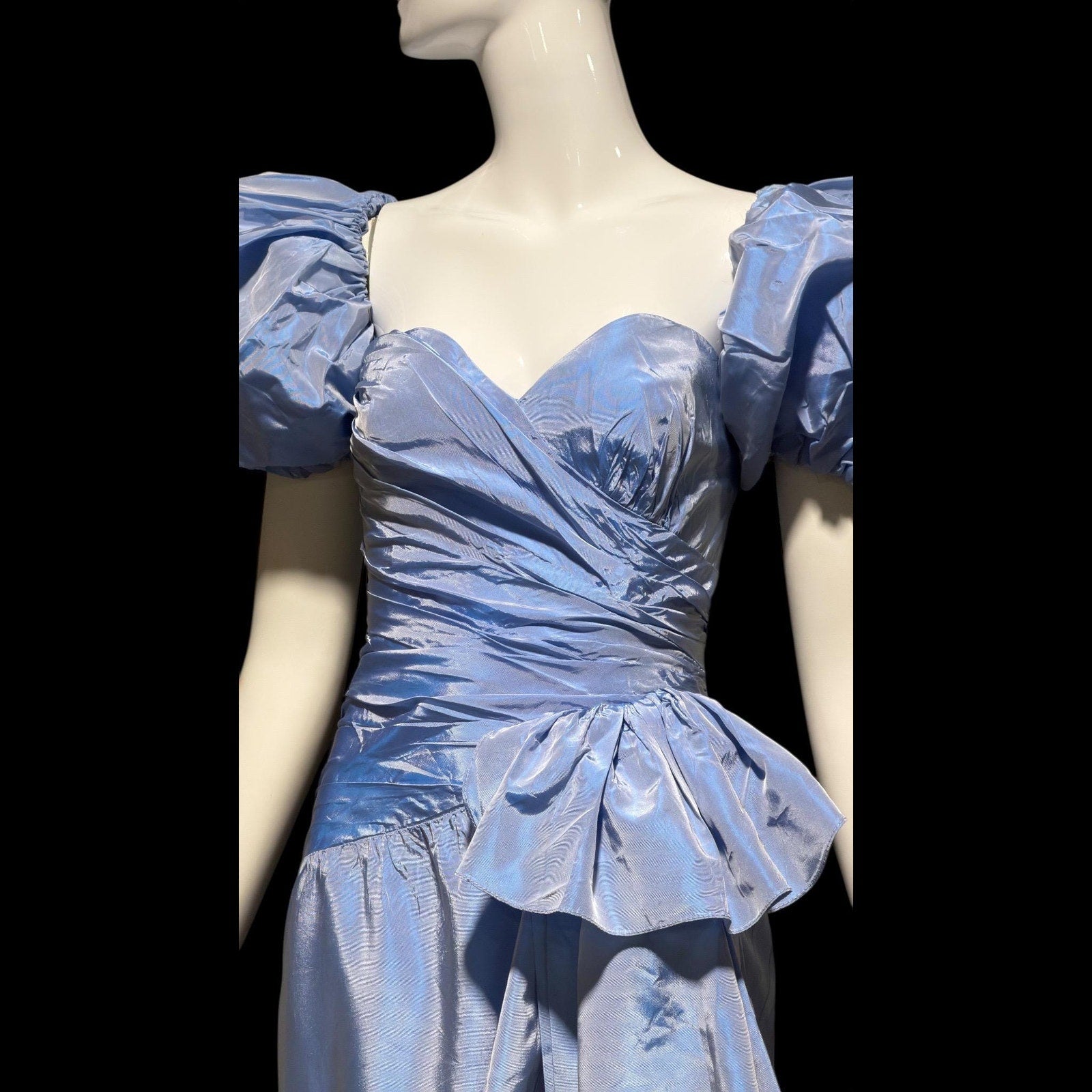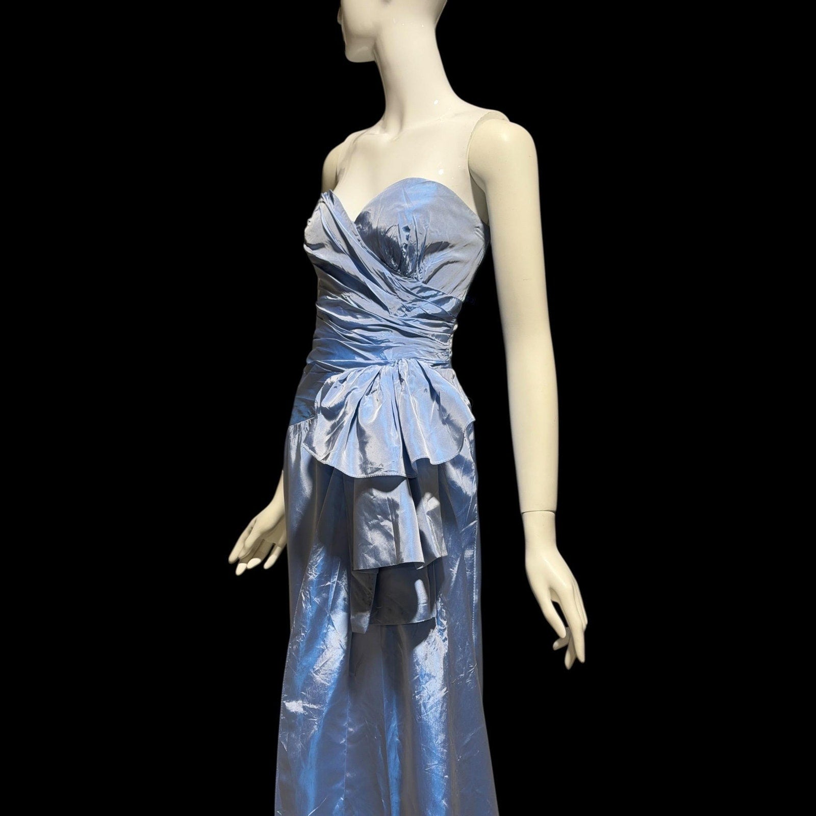 1980s vintage evening dress, Iridescent blue taffeta and ruffles, strapless prom party dress, medium