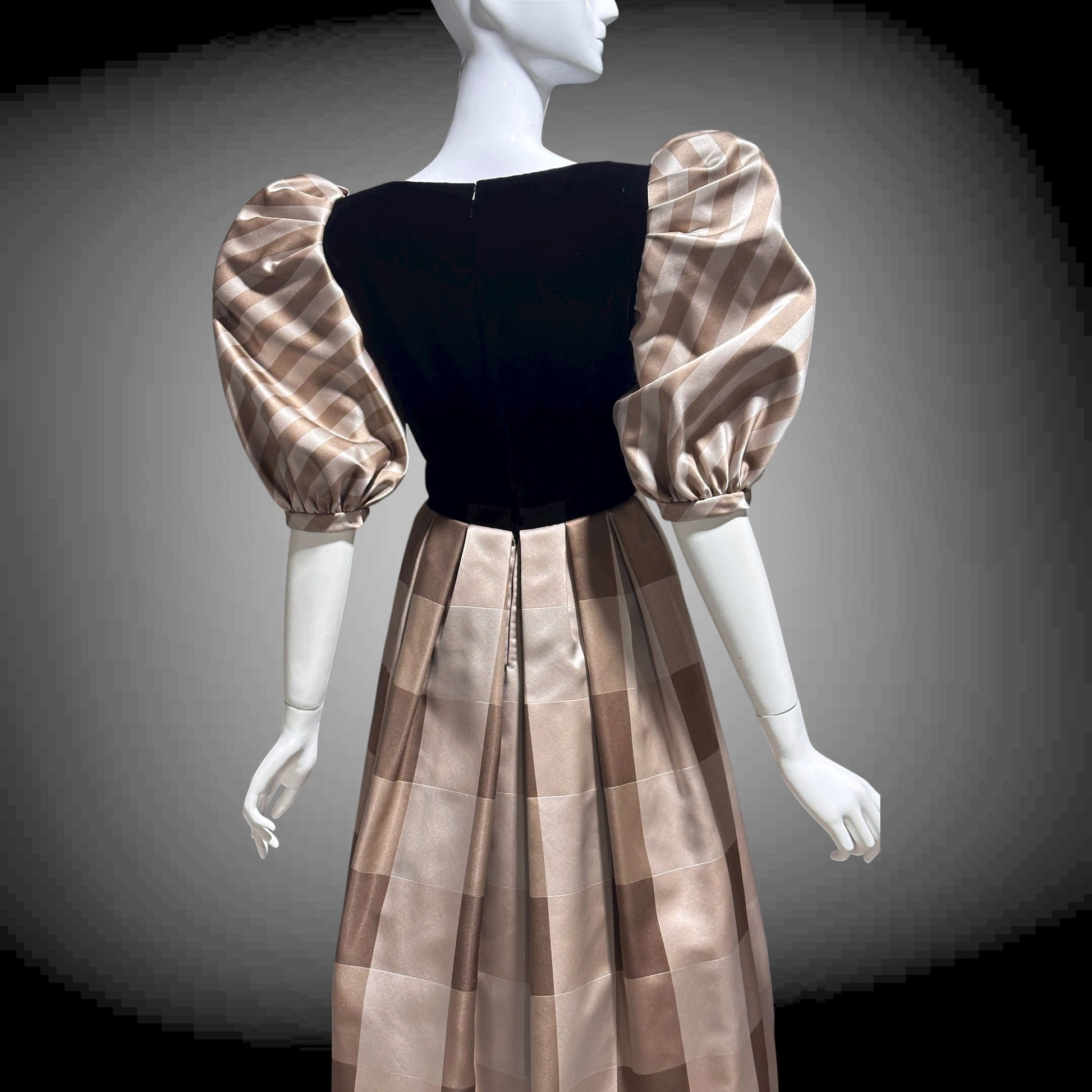 Silk formal dress with black velvet bodice and brown mocha plaid puffed sleeves.