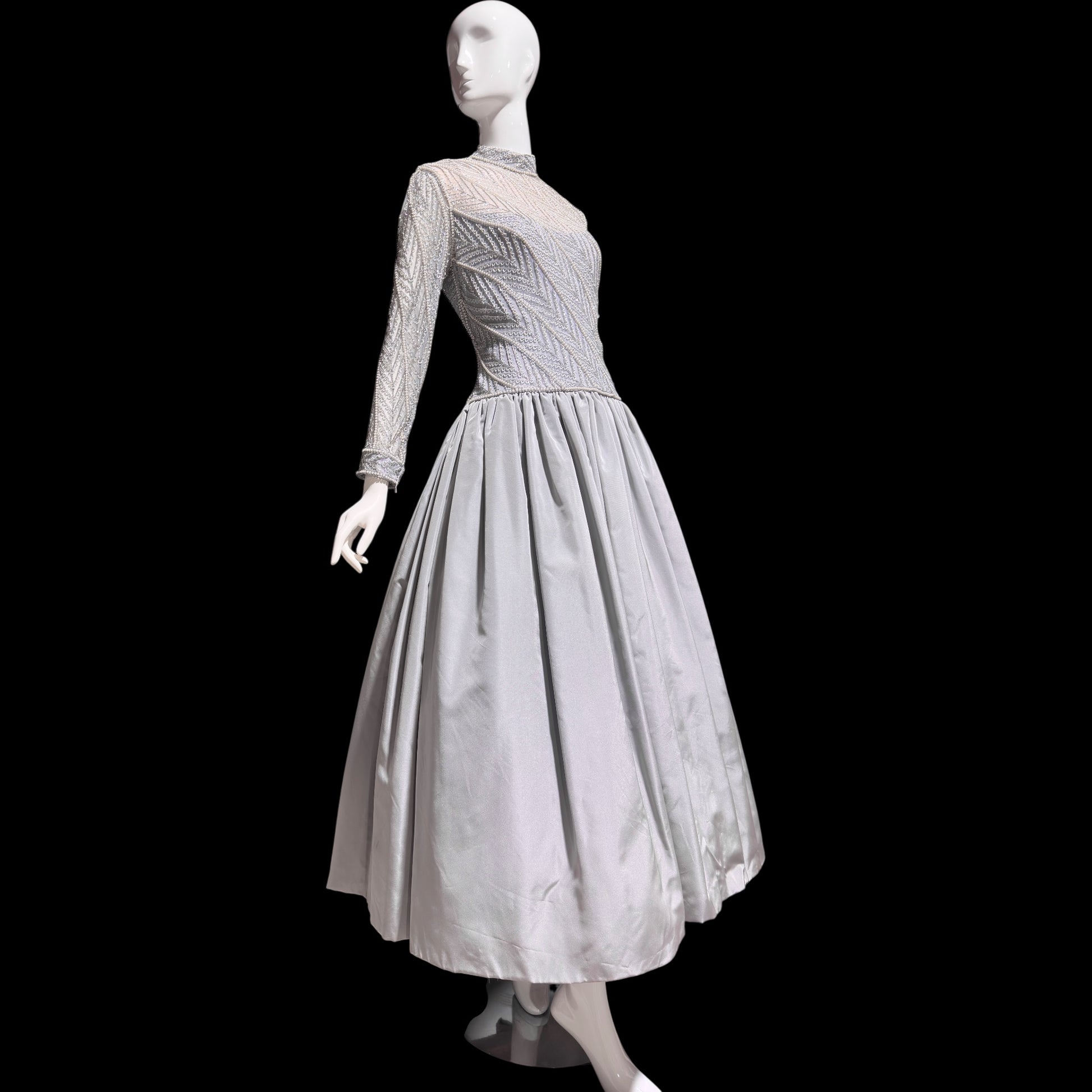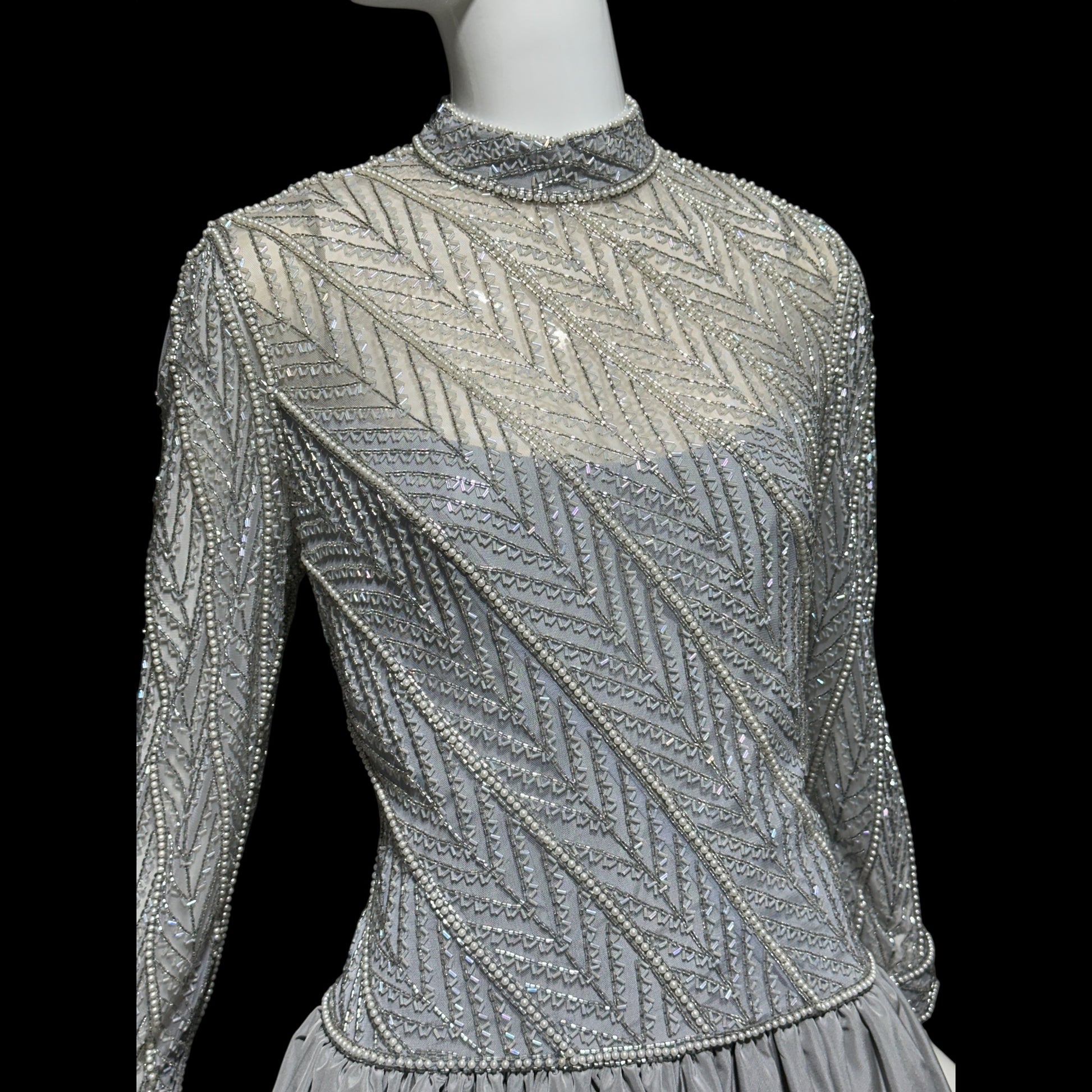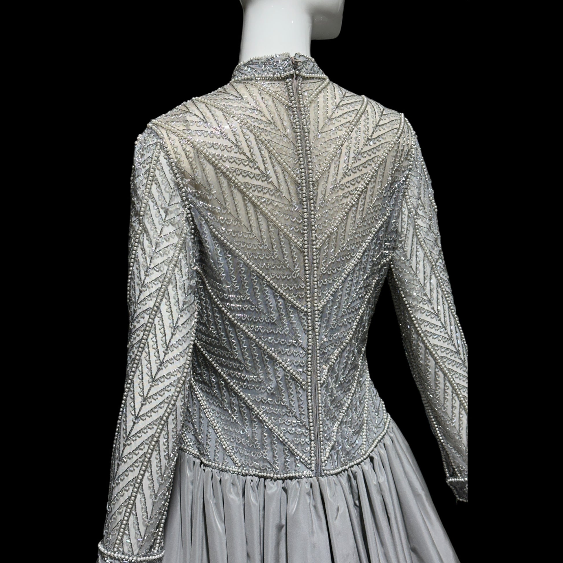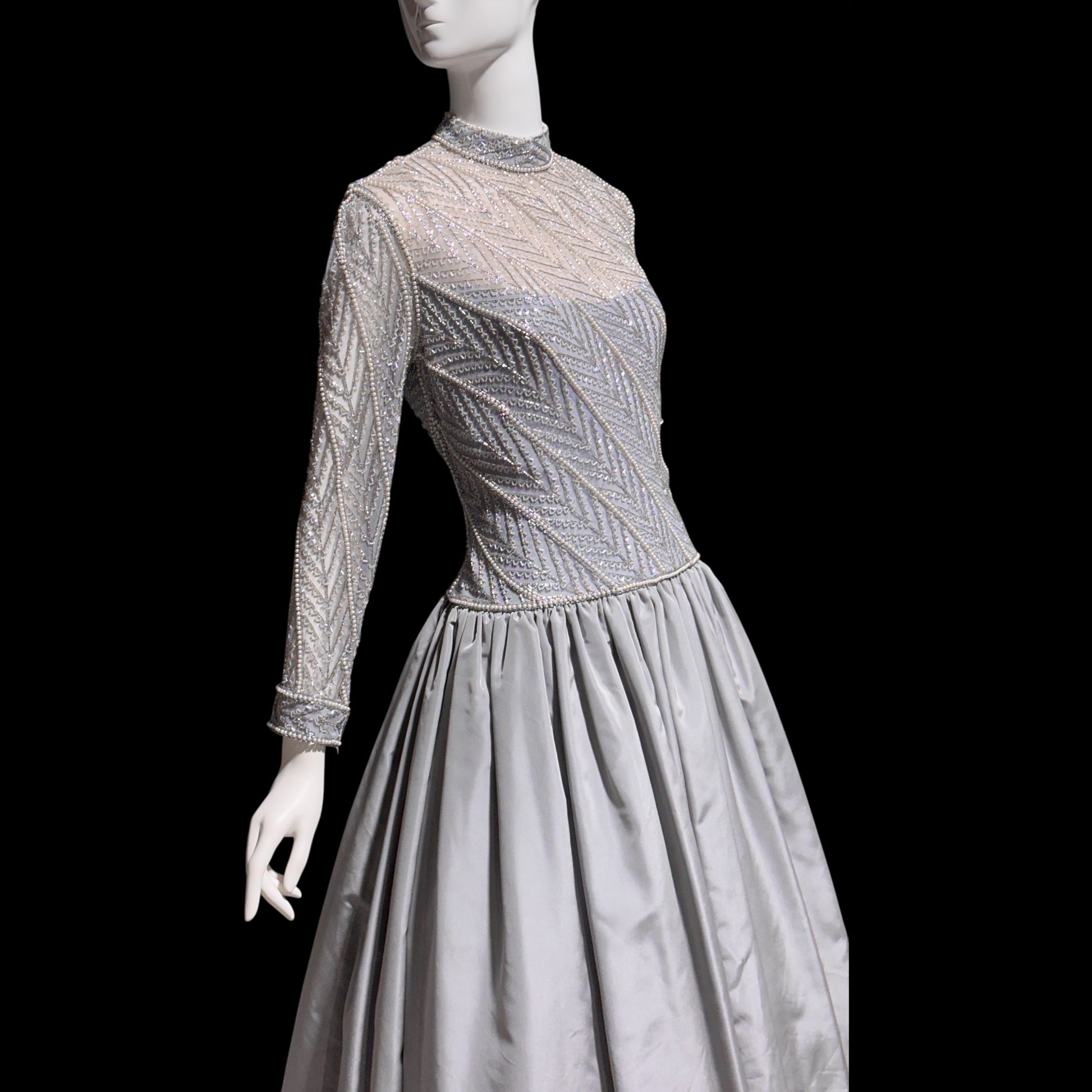 BOB MACKIE, vintage 1980s evening dress ball gown, Silver grey heavily beaded taffeta gown, Long sleeve high neck