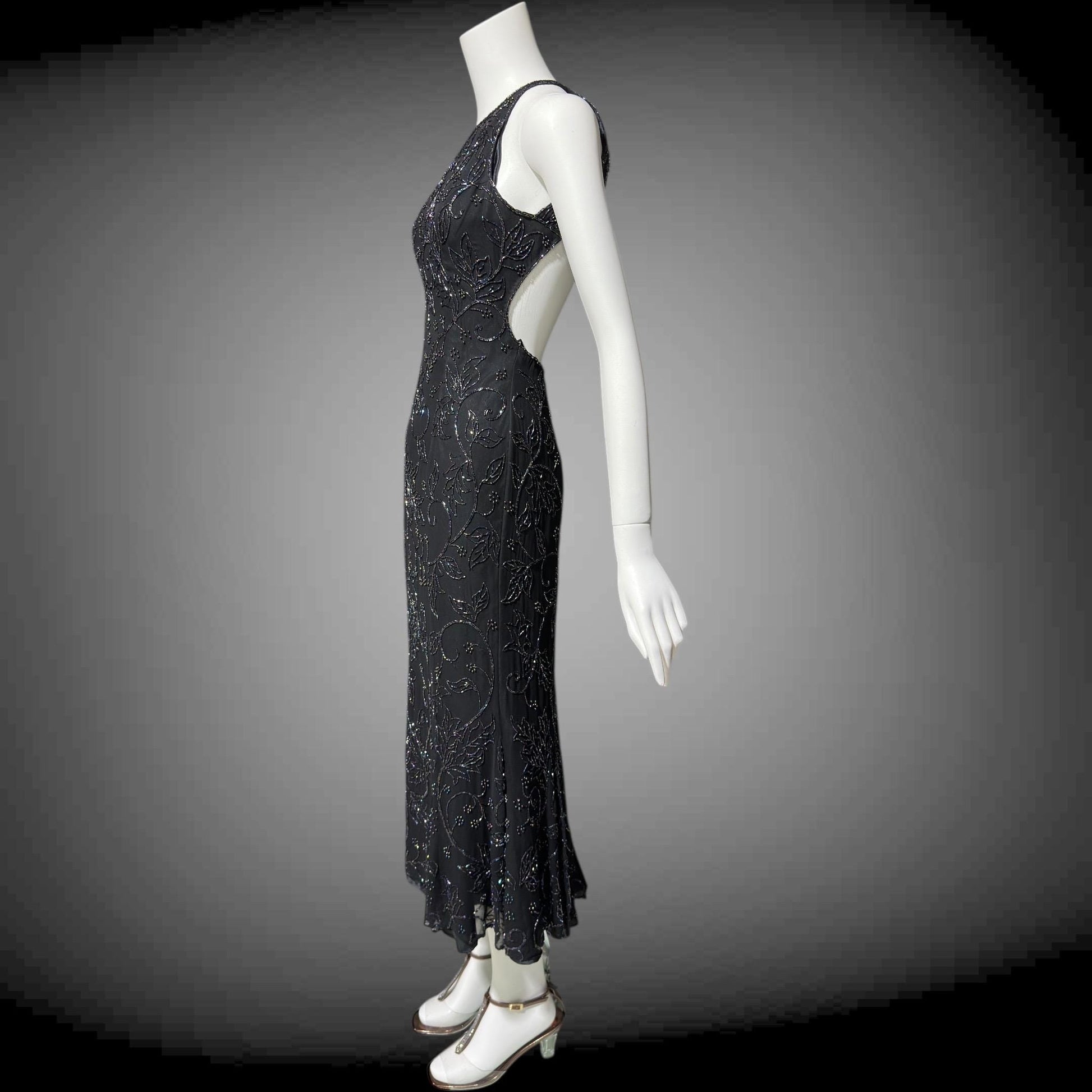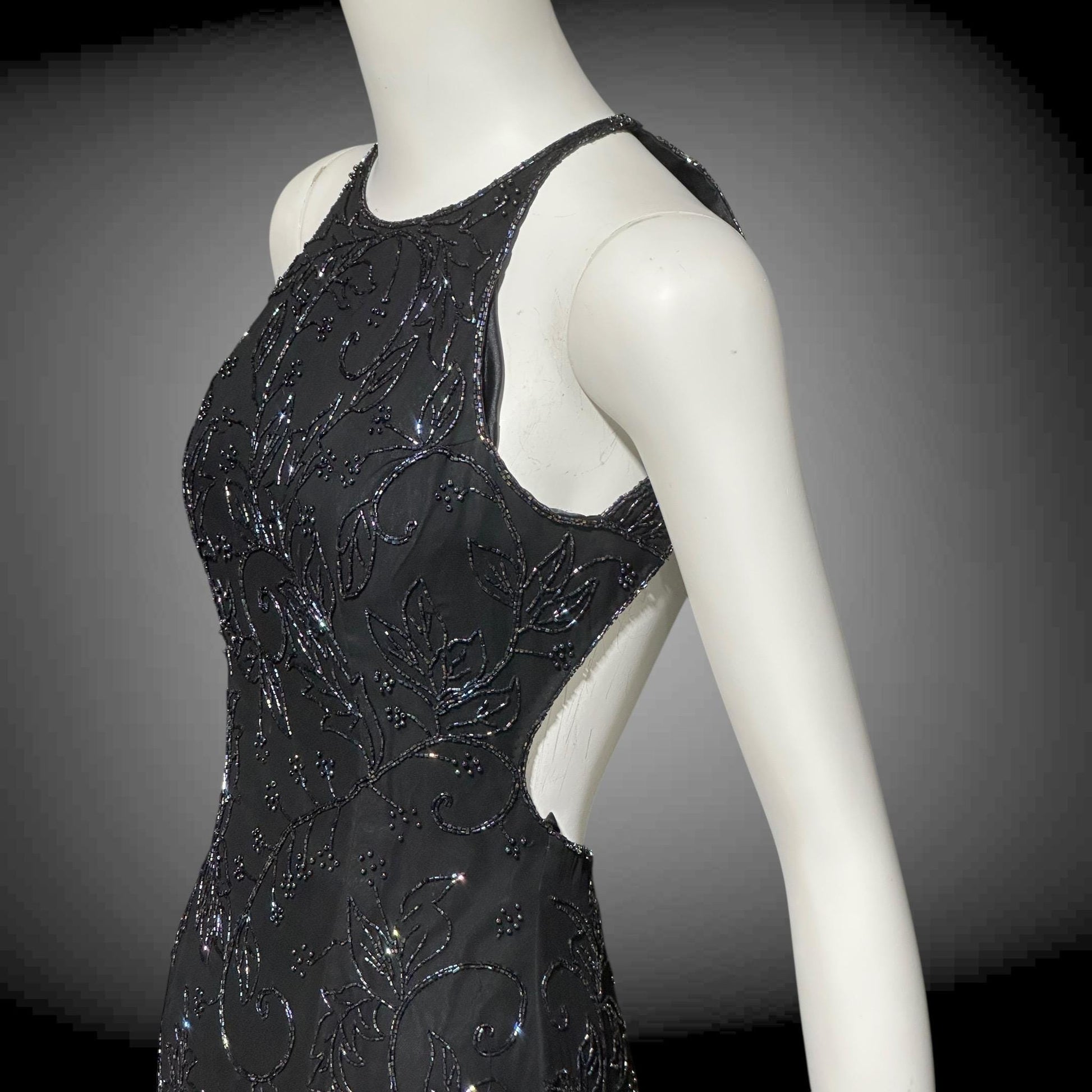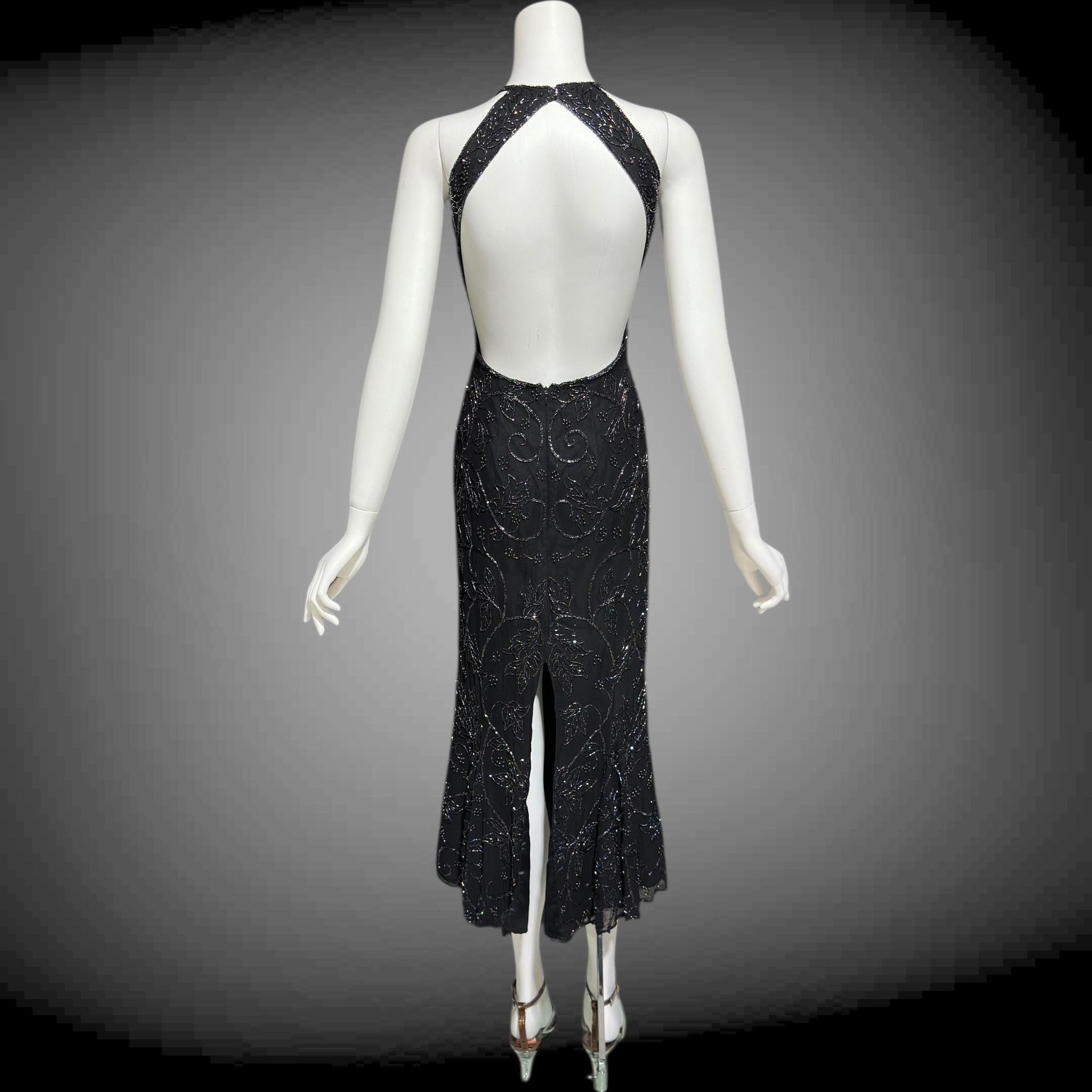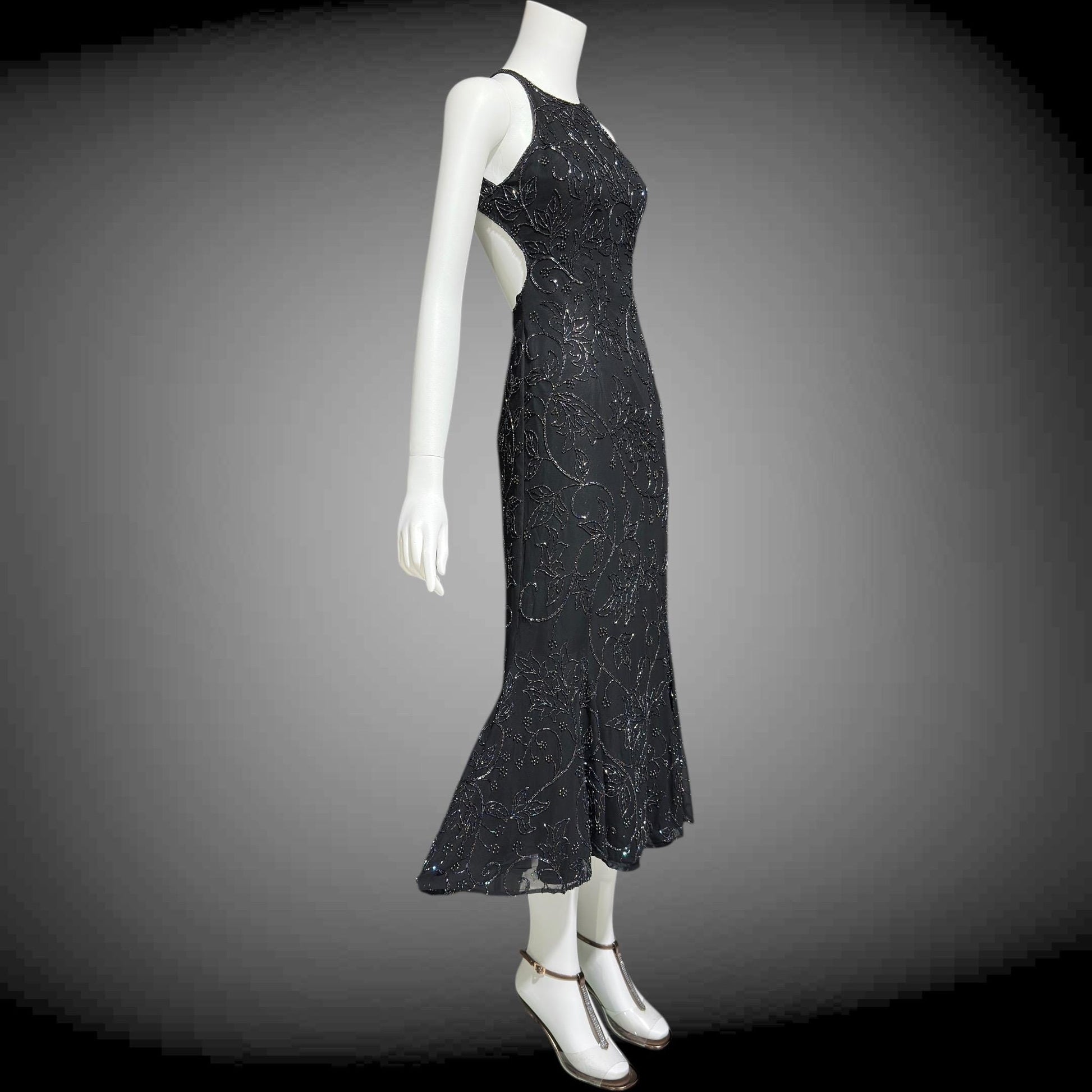 CACHE vintage 1990s evening dress, Bodycon black beaded racer back sheath slip dress, backless cocktail party dress