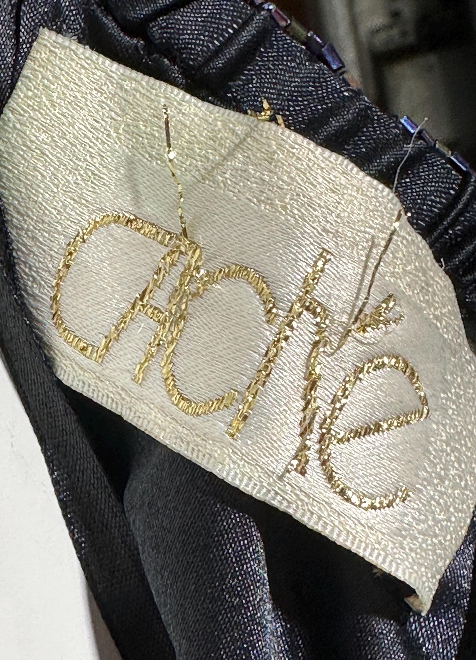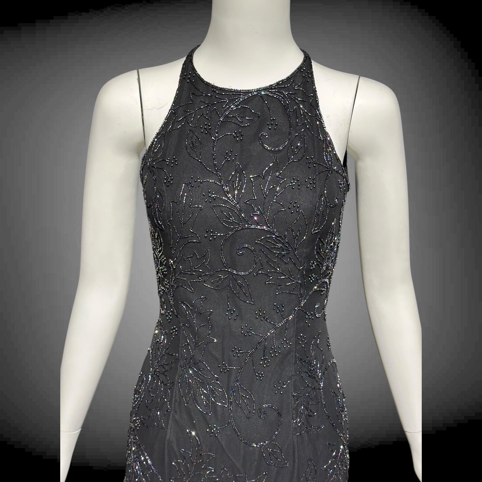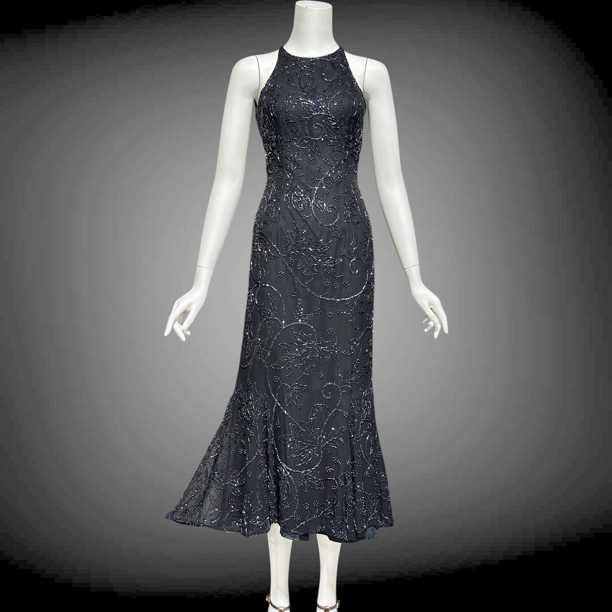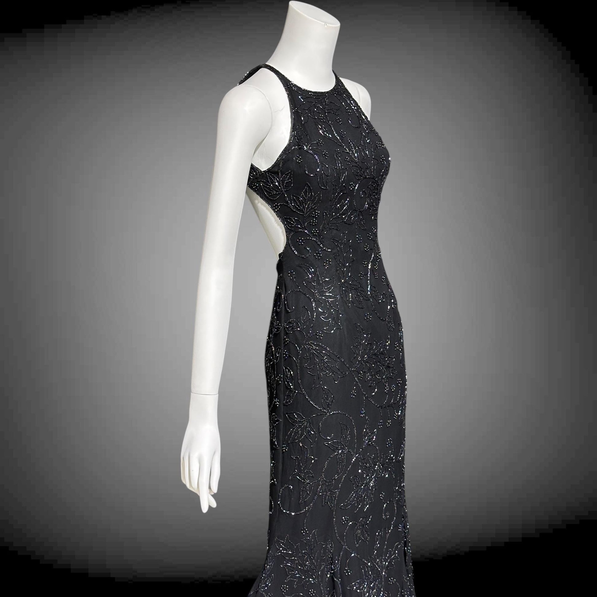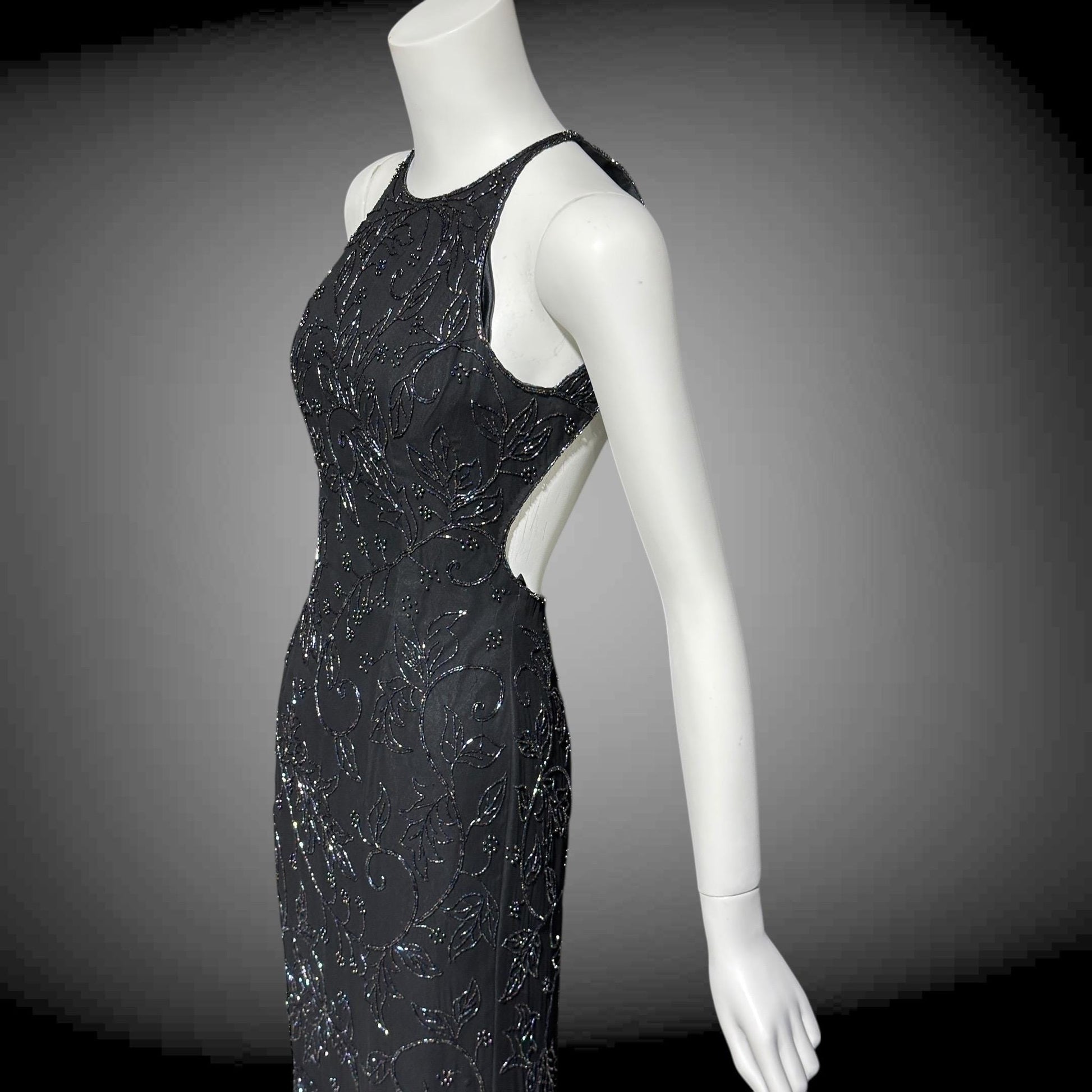 CACHE vintage 1990s evening dress, Bodycon black beaded racer back sheath slip dress, backless cocktail party dress
