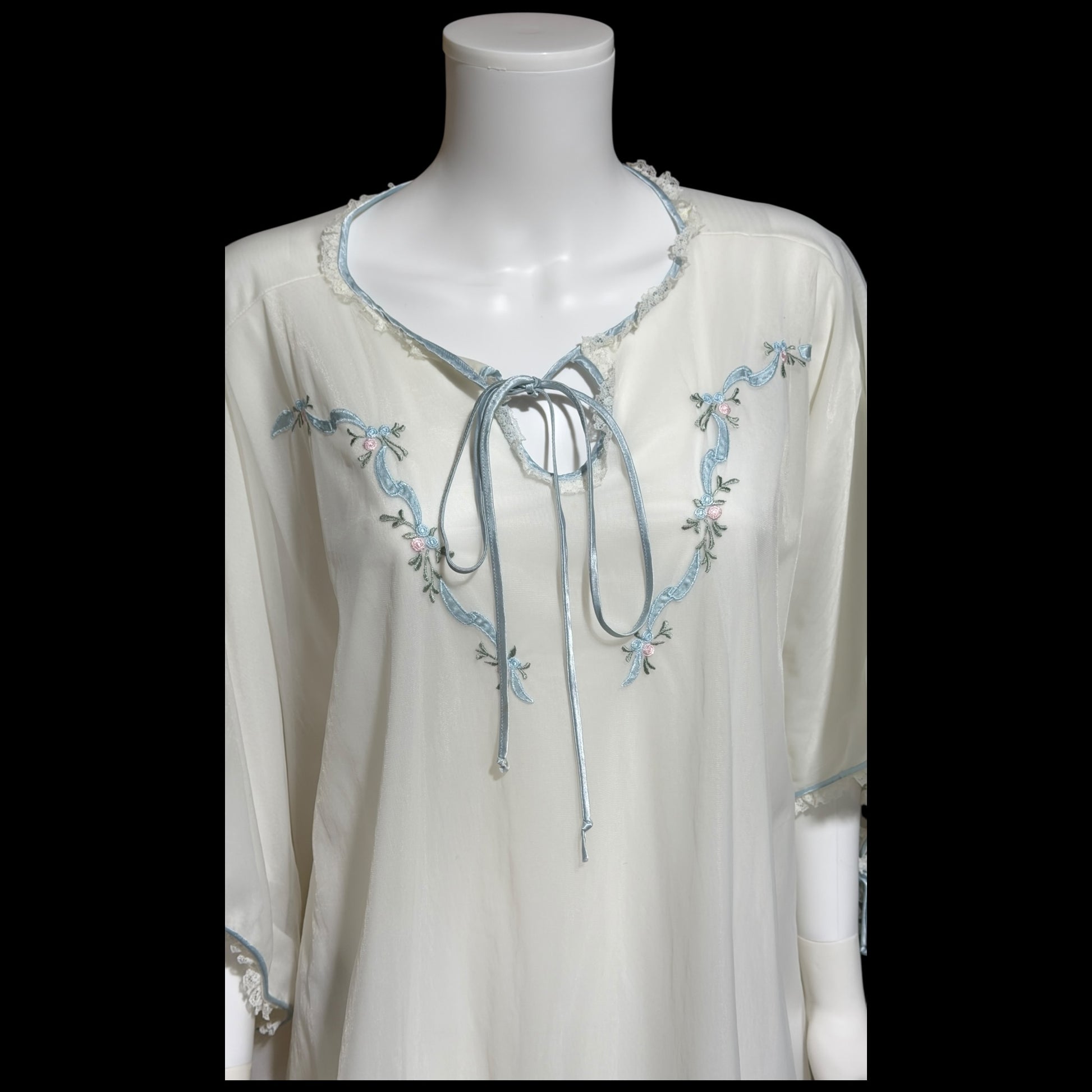 Color - Dreamy white with baby blue ribbon and embroidered flowers.