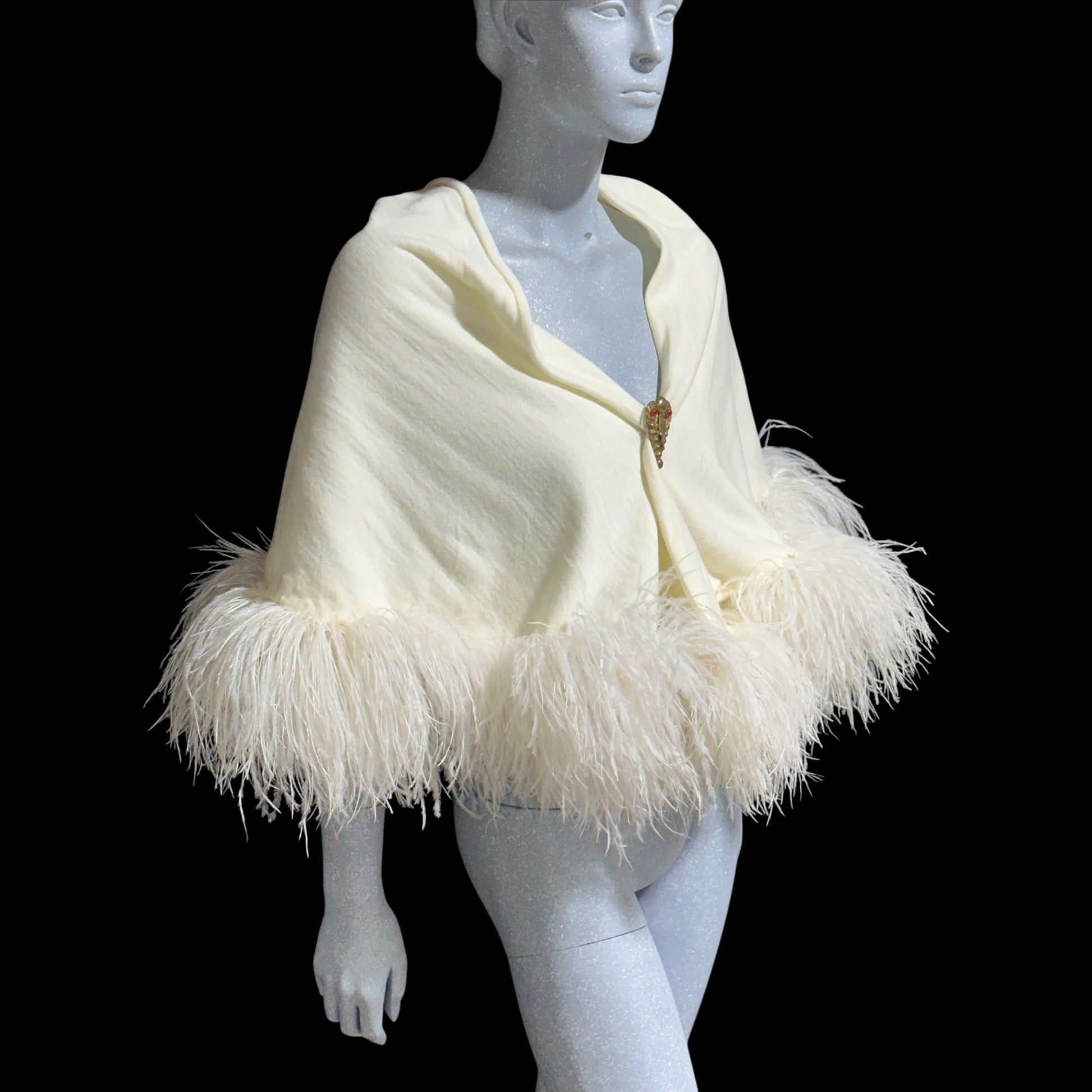 ECHO ORIGINATIONS, Vintage 1930s Ostrich Feather Cape Shawl, Creamy White warm knit evening bridal wedding wrap