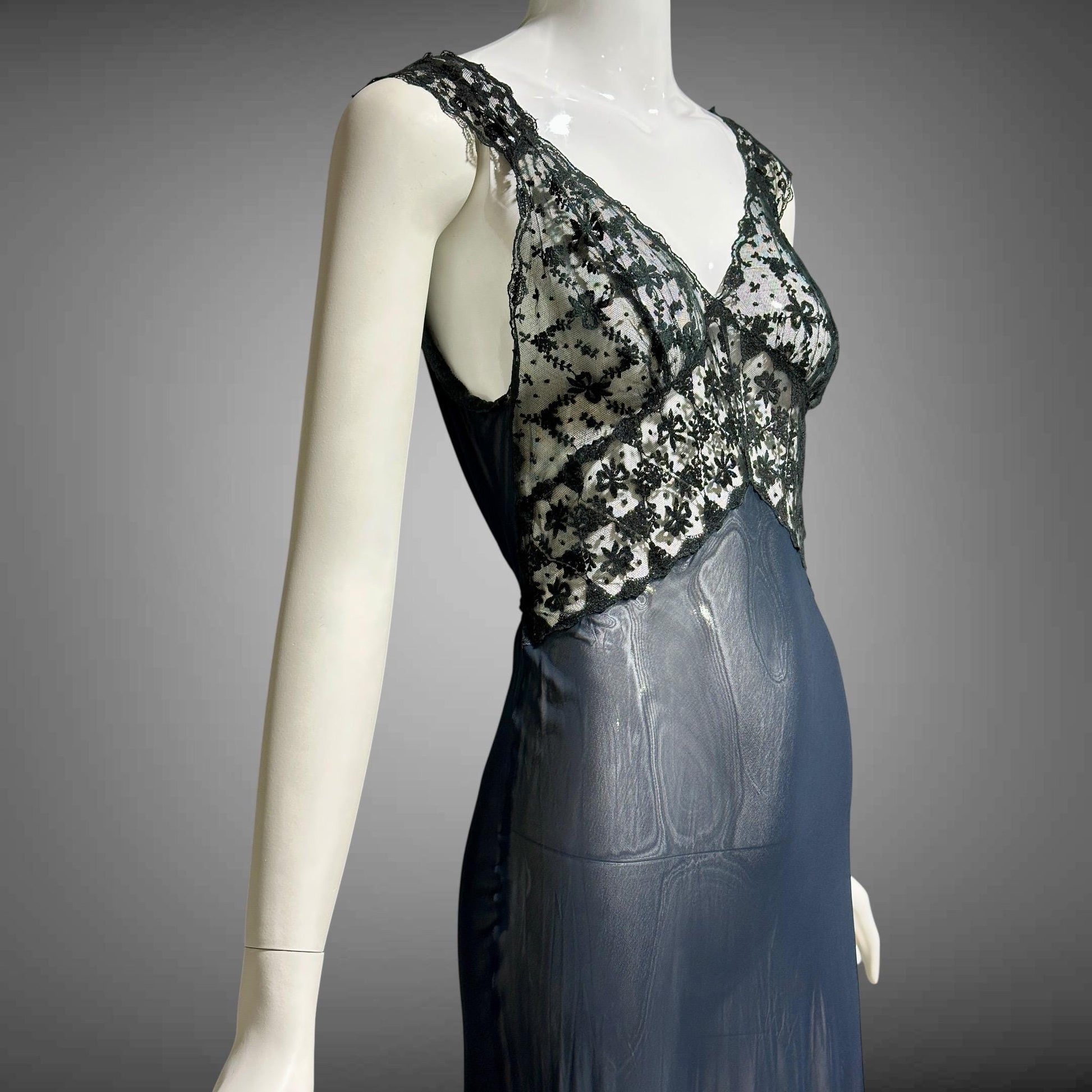 LADY DUFF, vintage 1930s Nightgown slip dress, sheer sultry black night dress, bias cut with lace