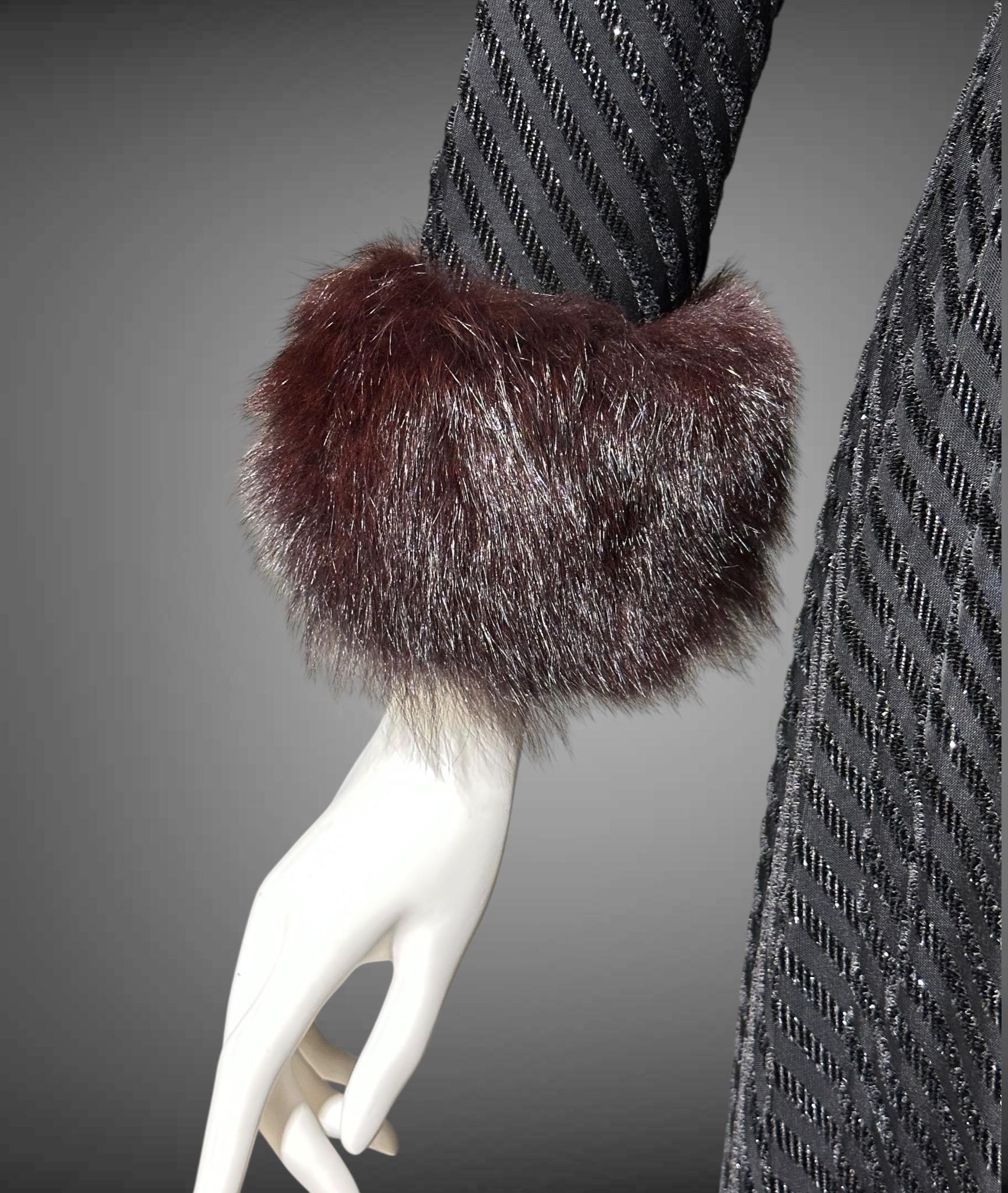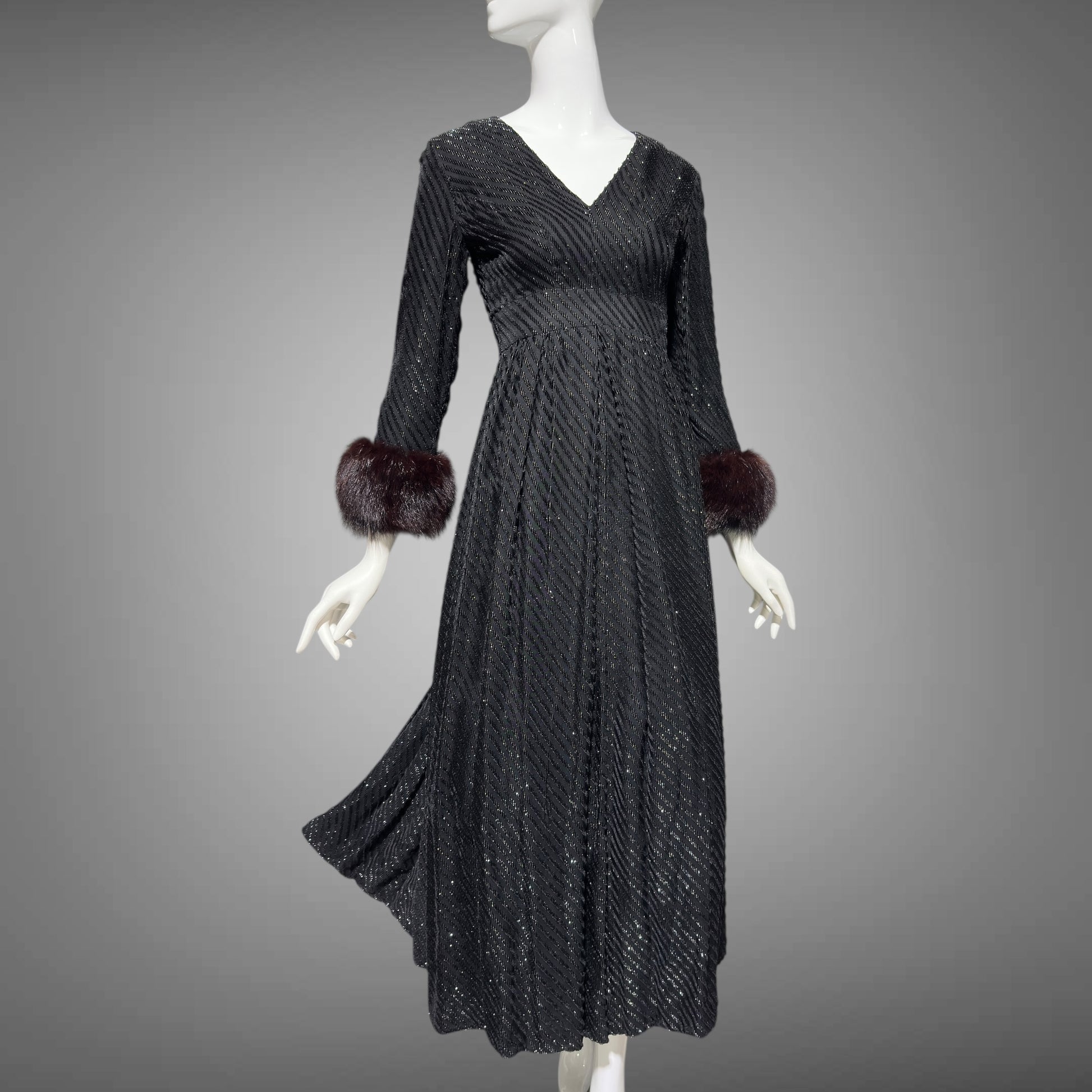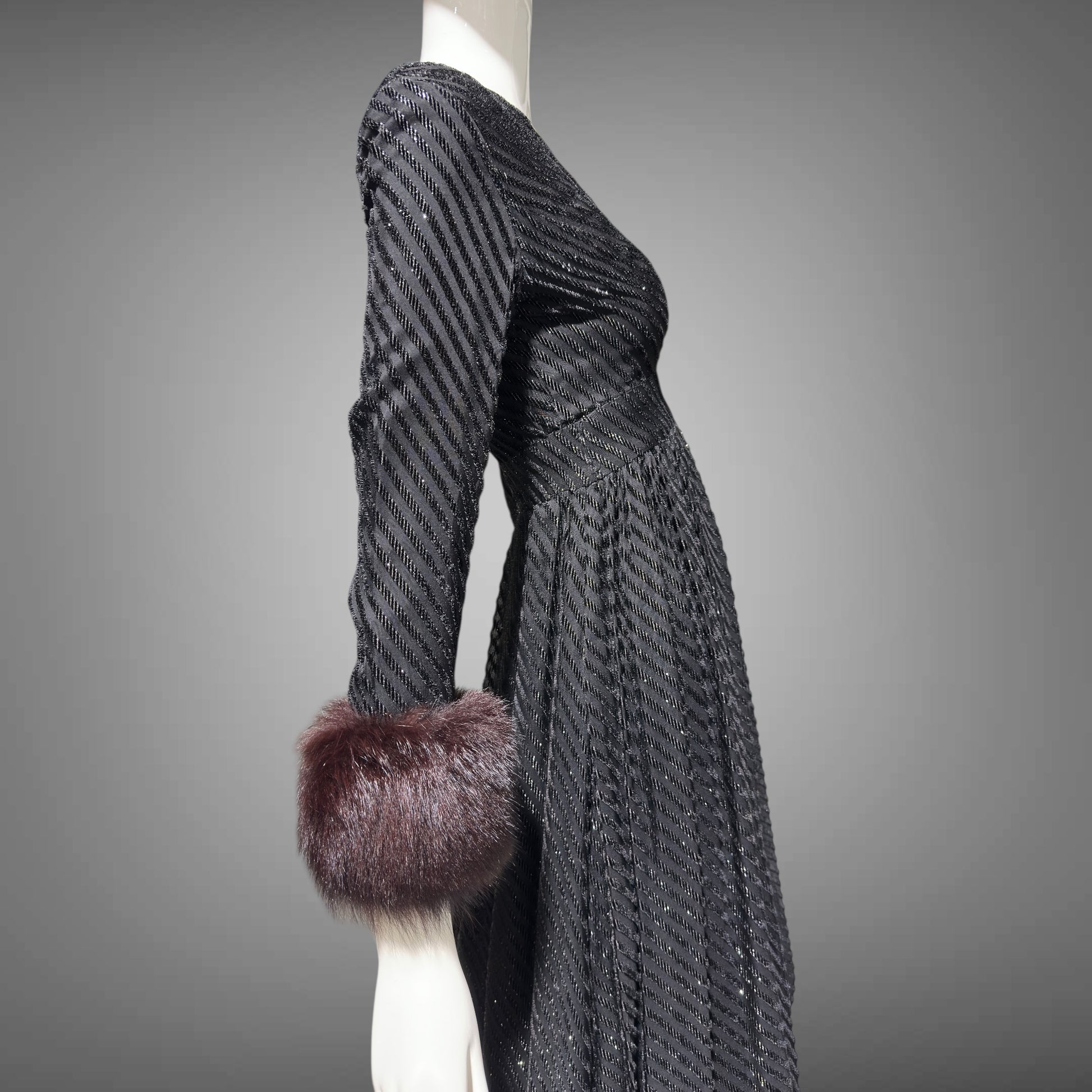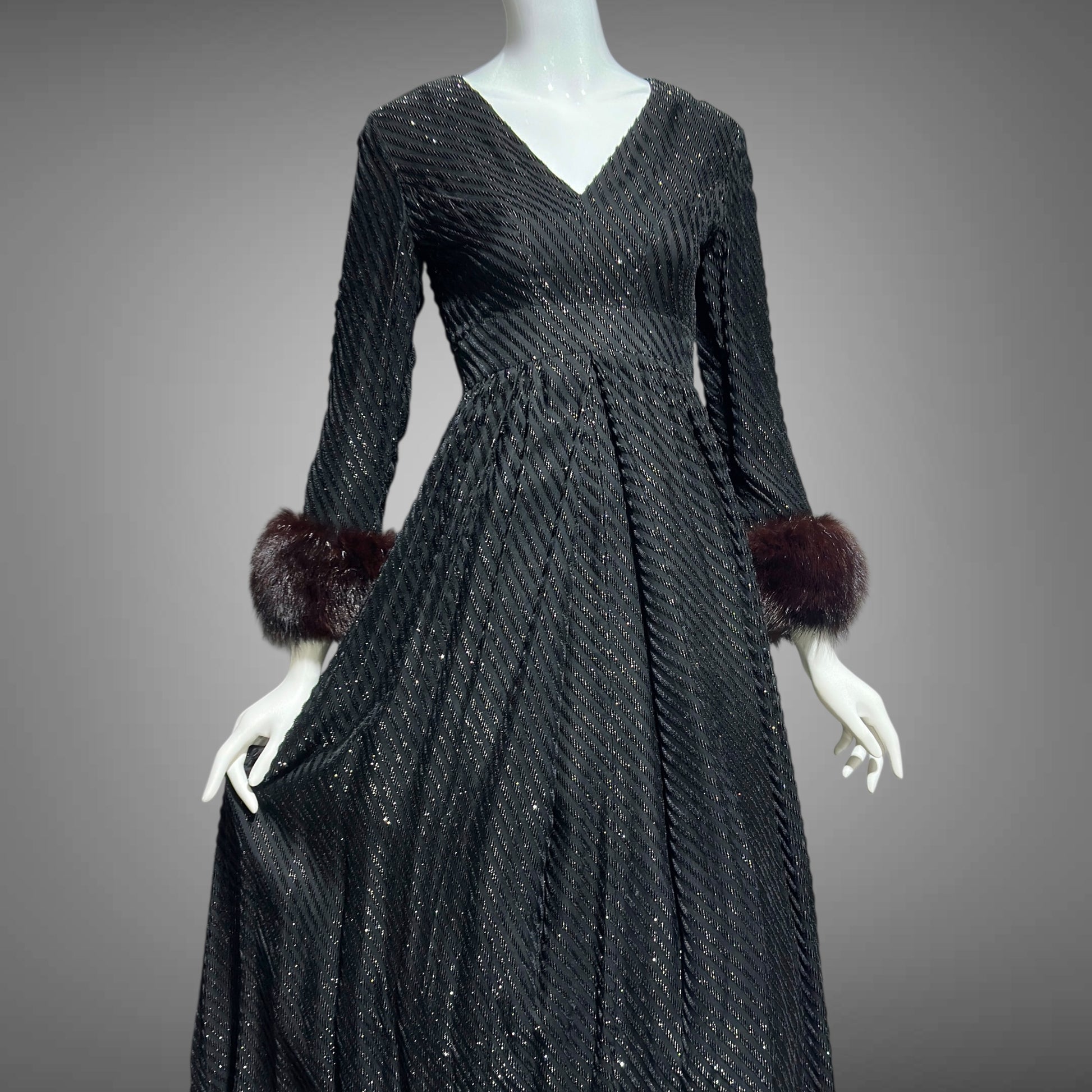 LILLIE RUBIN Vintage 1970s evening gown, Black eye lash Sparkly Gown with Fur Cuffs