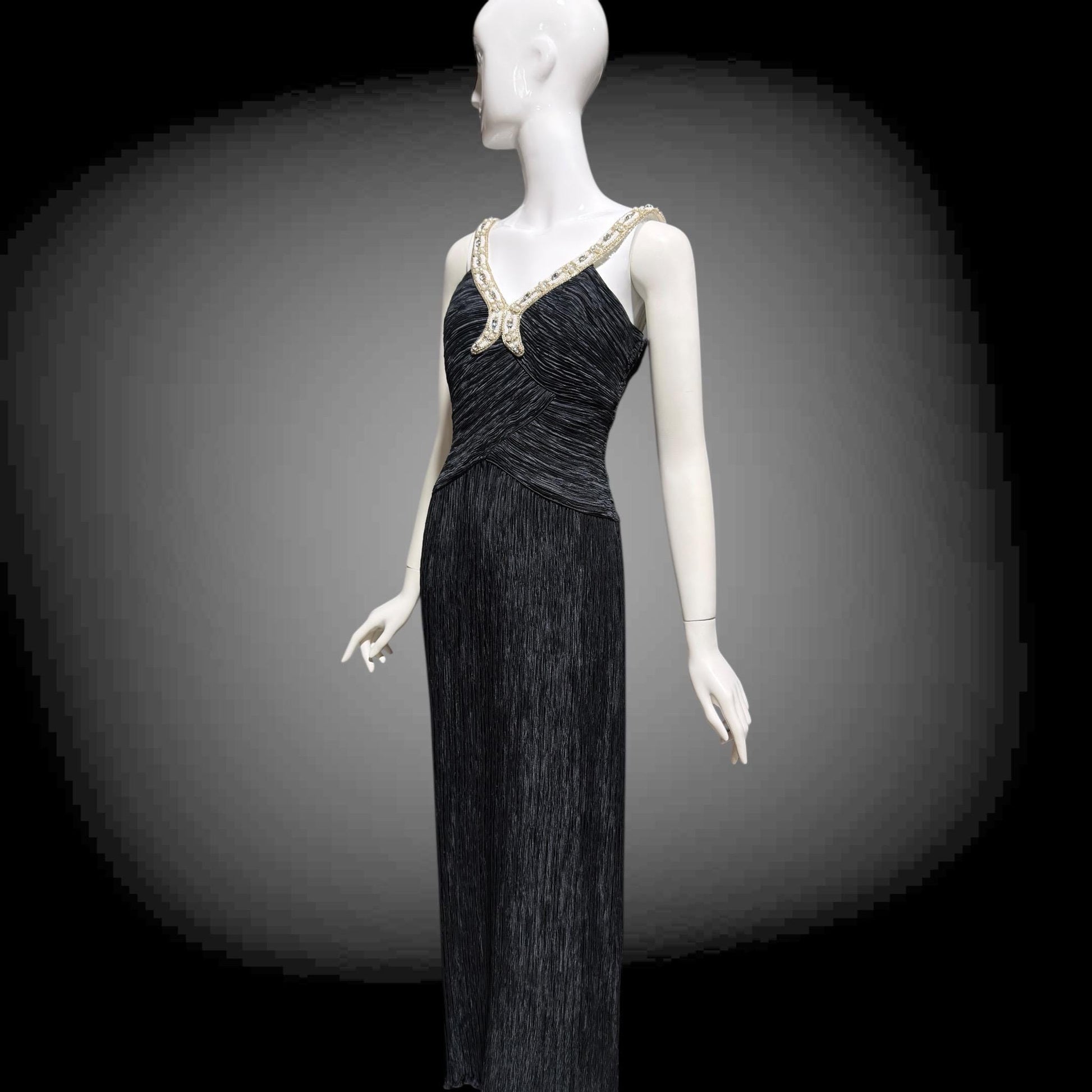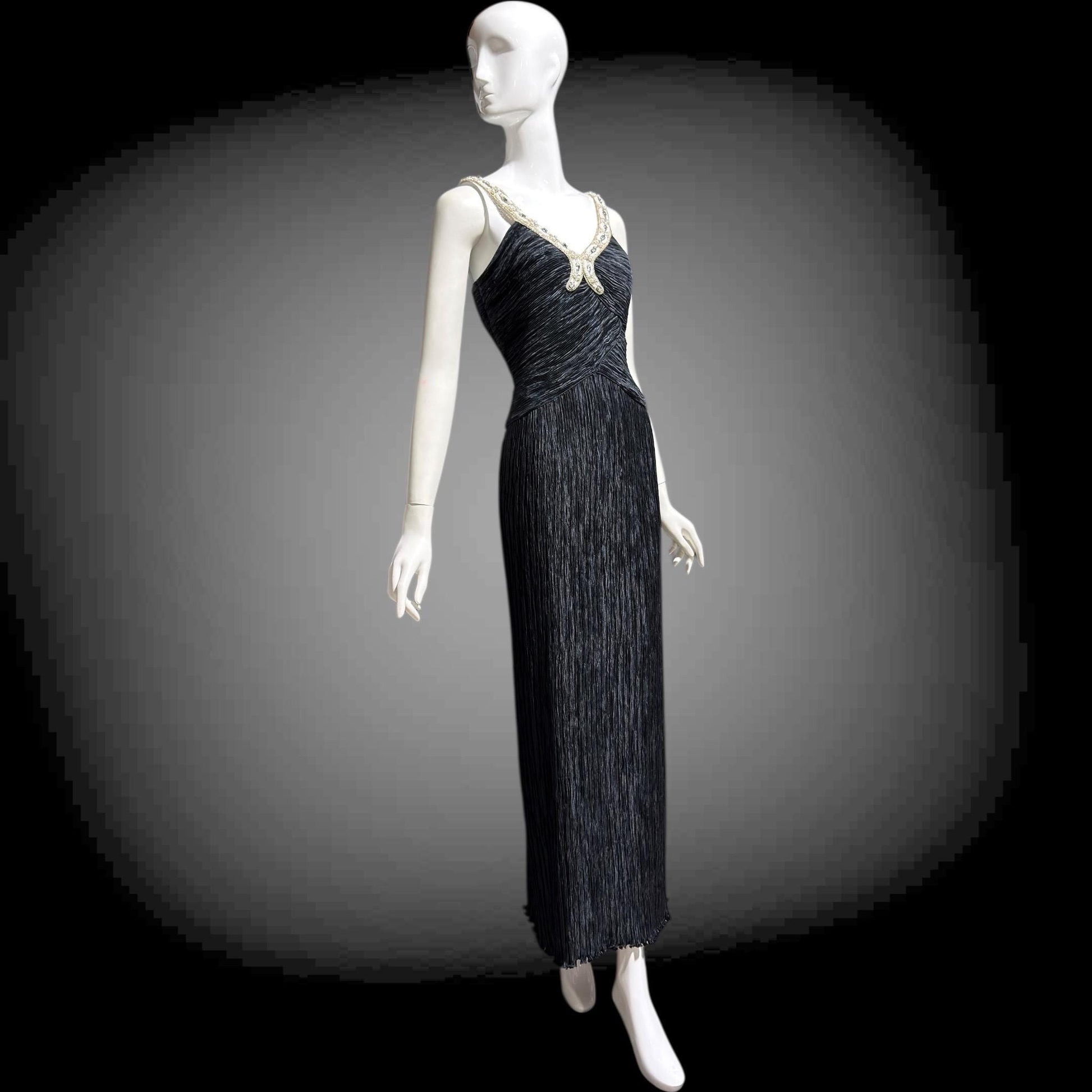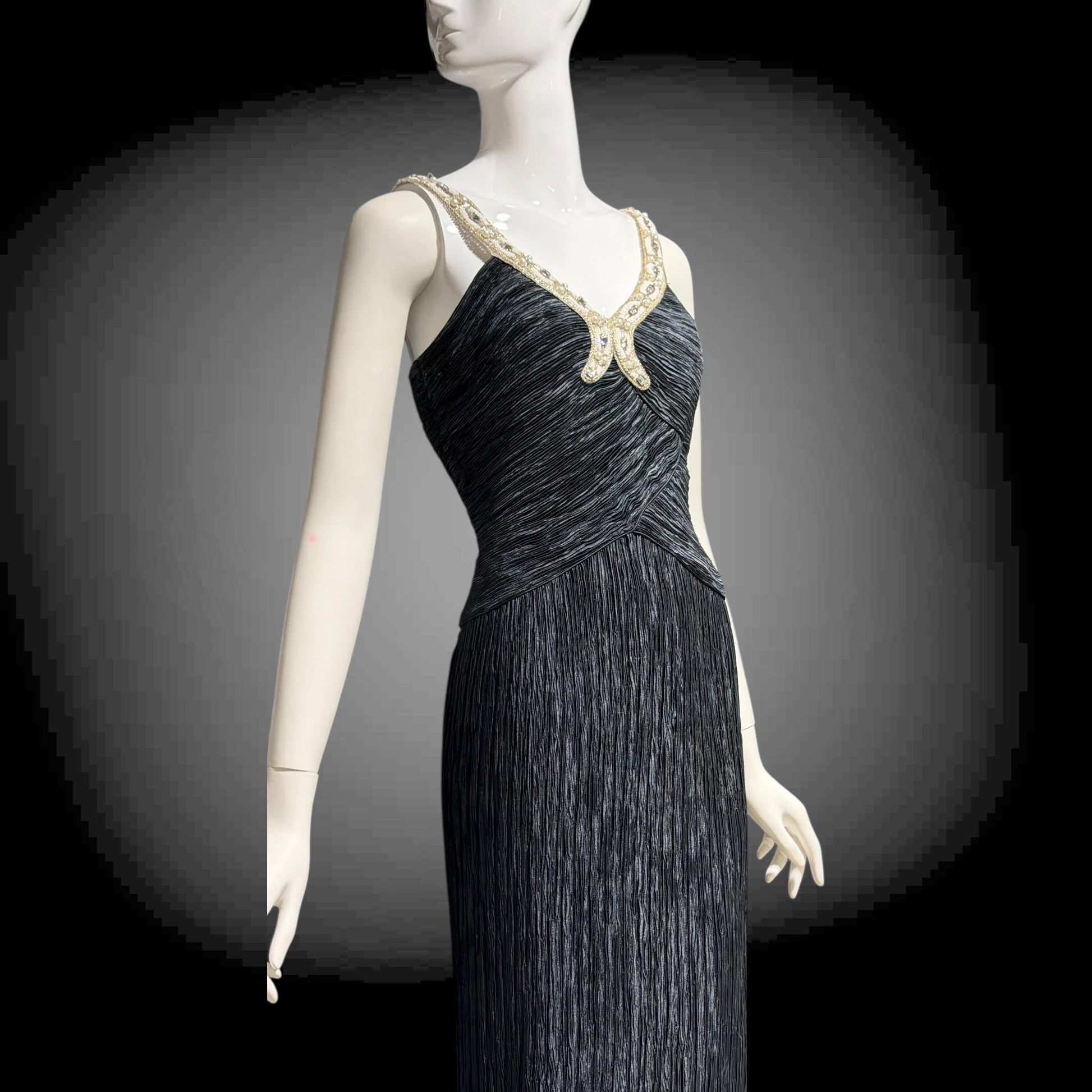 MARY MCFADDEN COUTURE 1980s black beaded plisse pleats gown