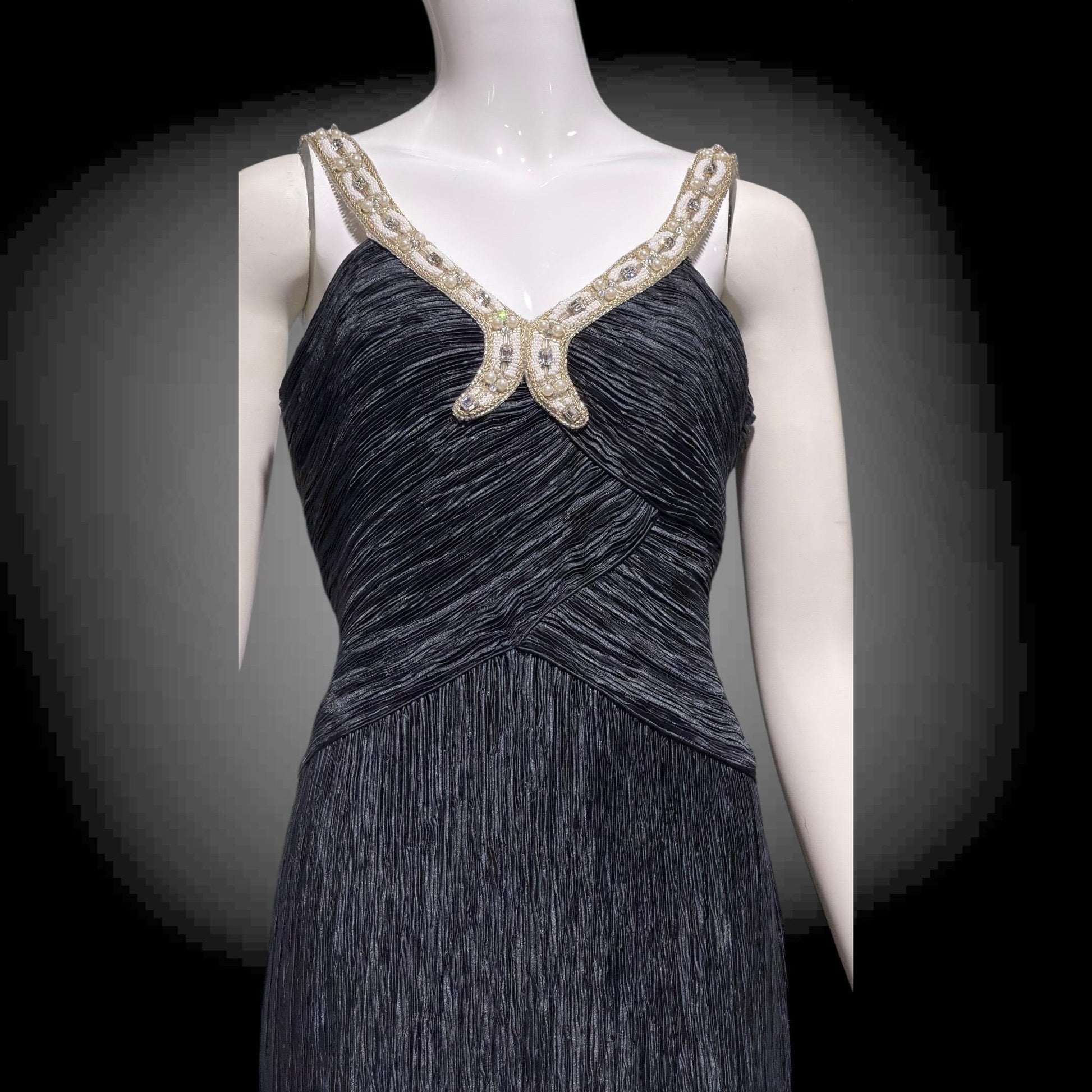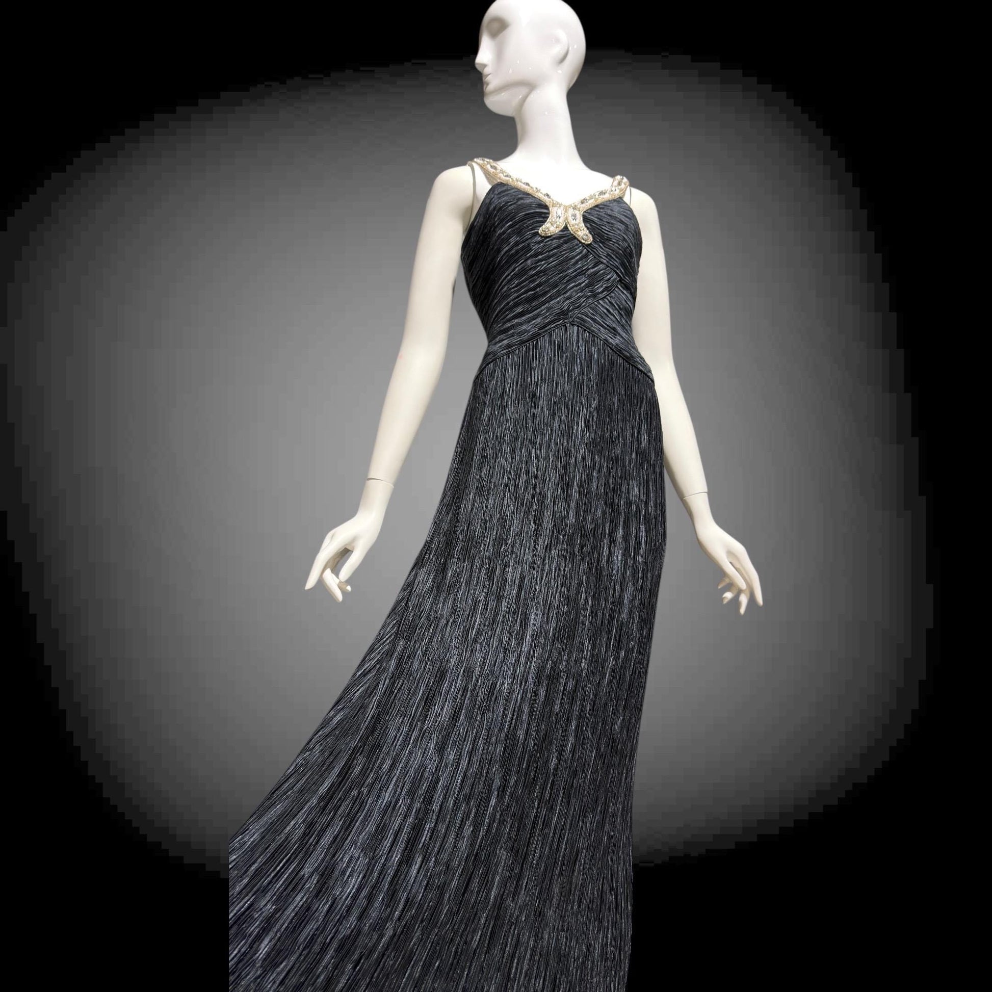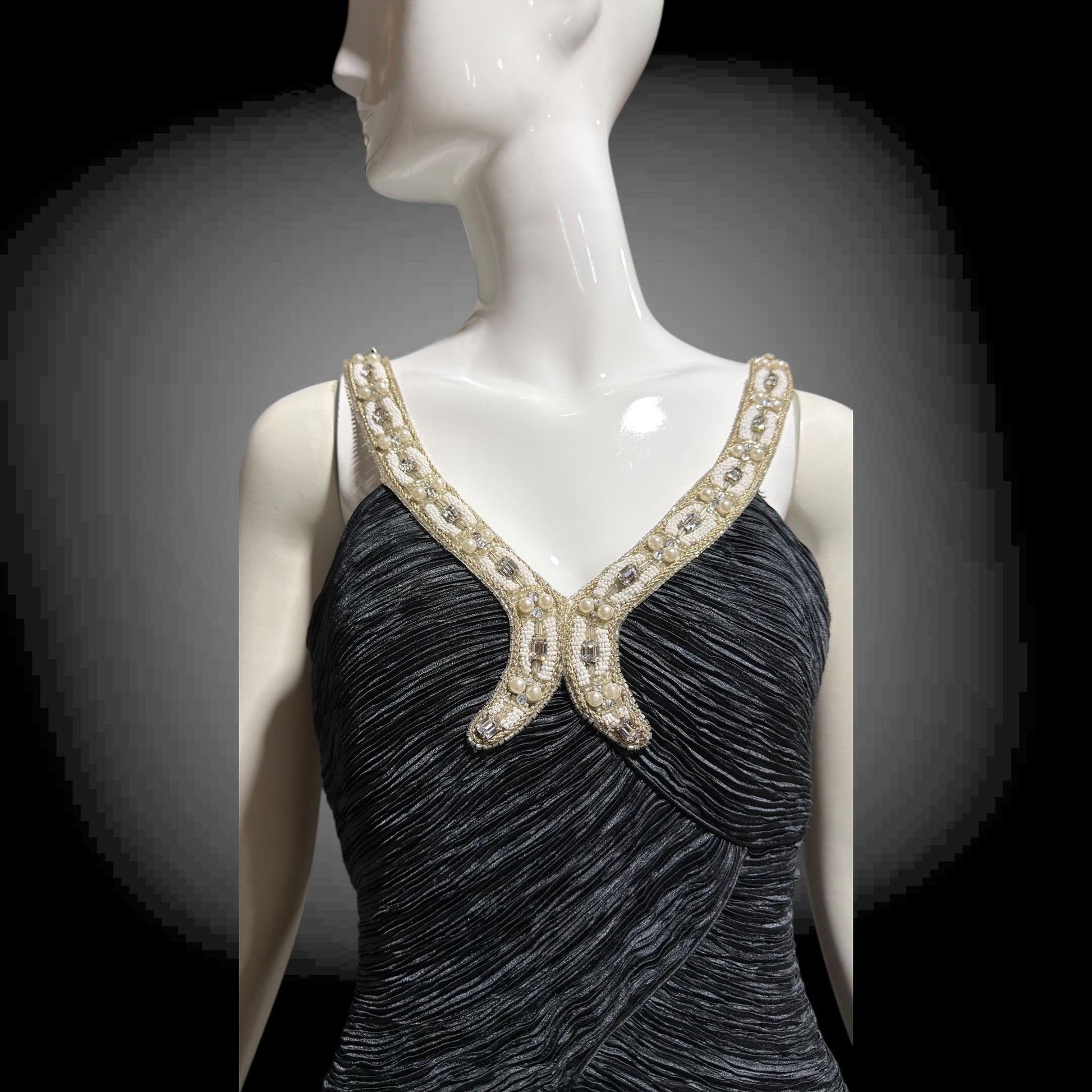 MARY MCFADDEN COUTURE 1980s black beaded plisse pleats gown