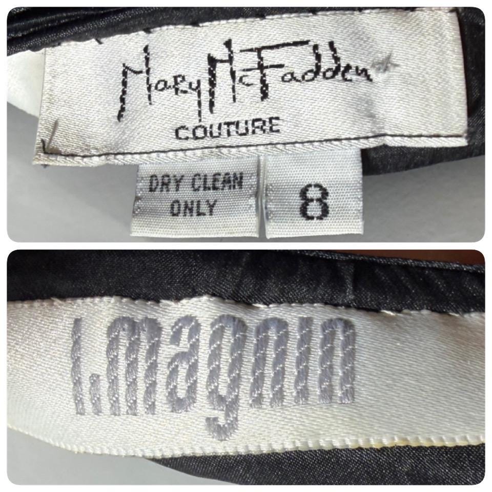 MARY MCFADDEN COUTURE vintage 1980s evening dress, I.Magnin black beaded plisse pleats gown