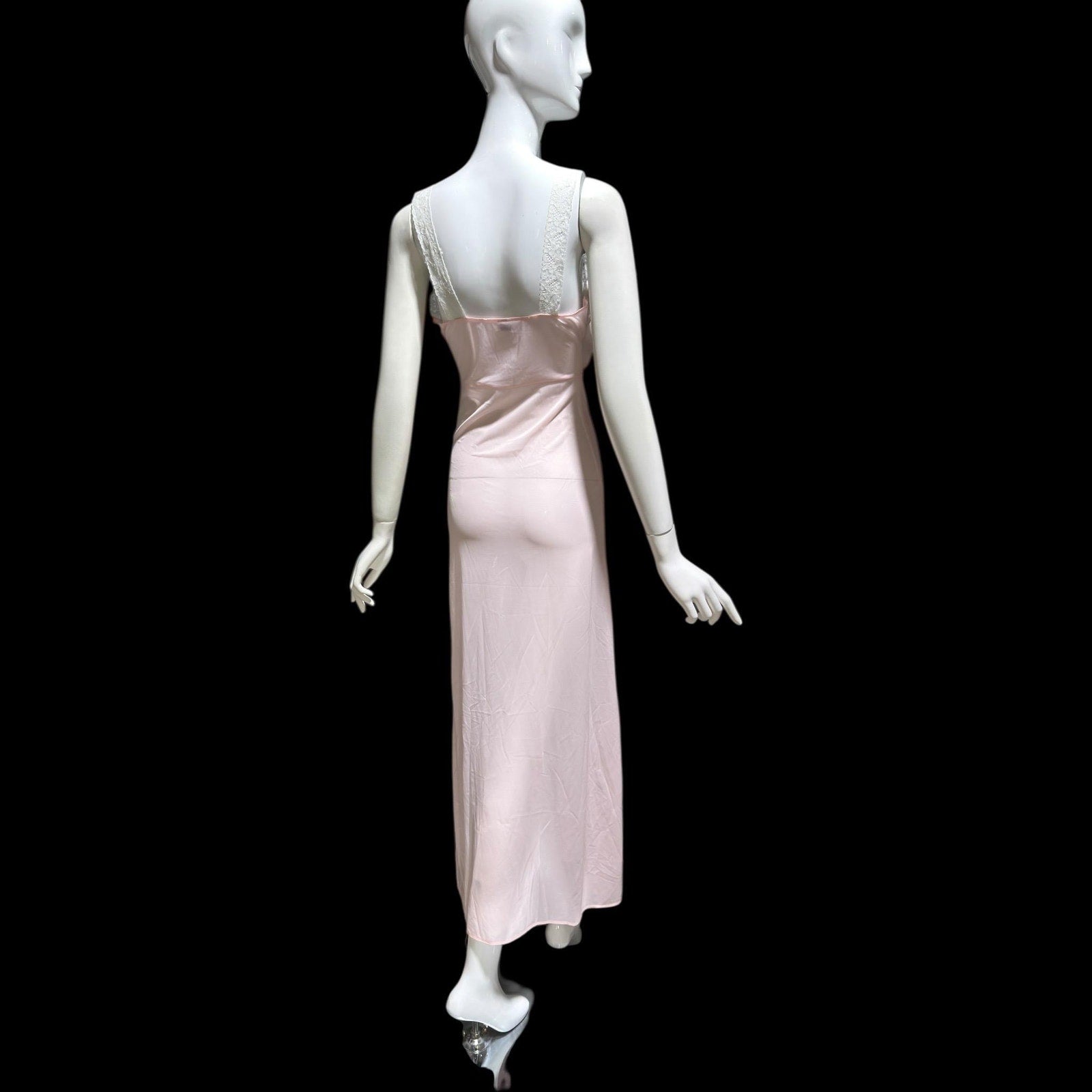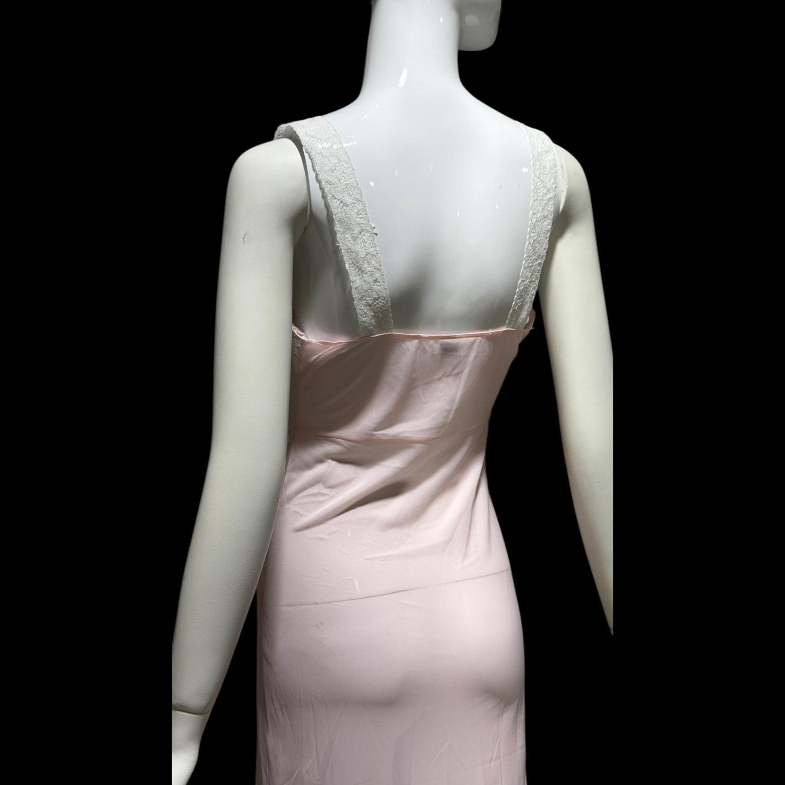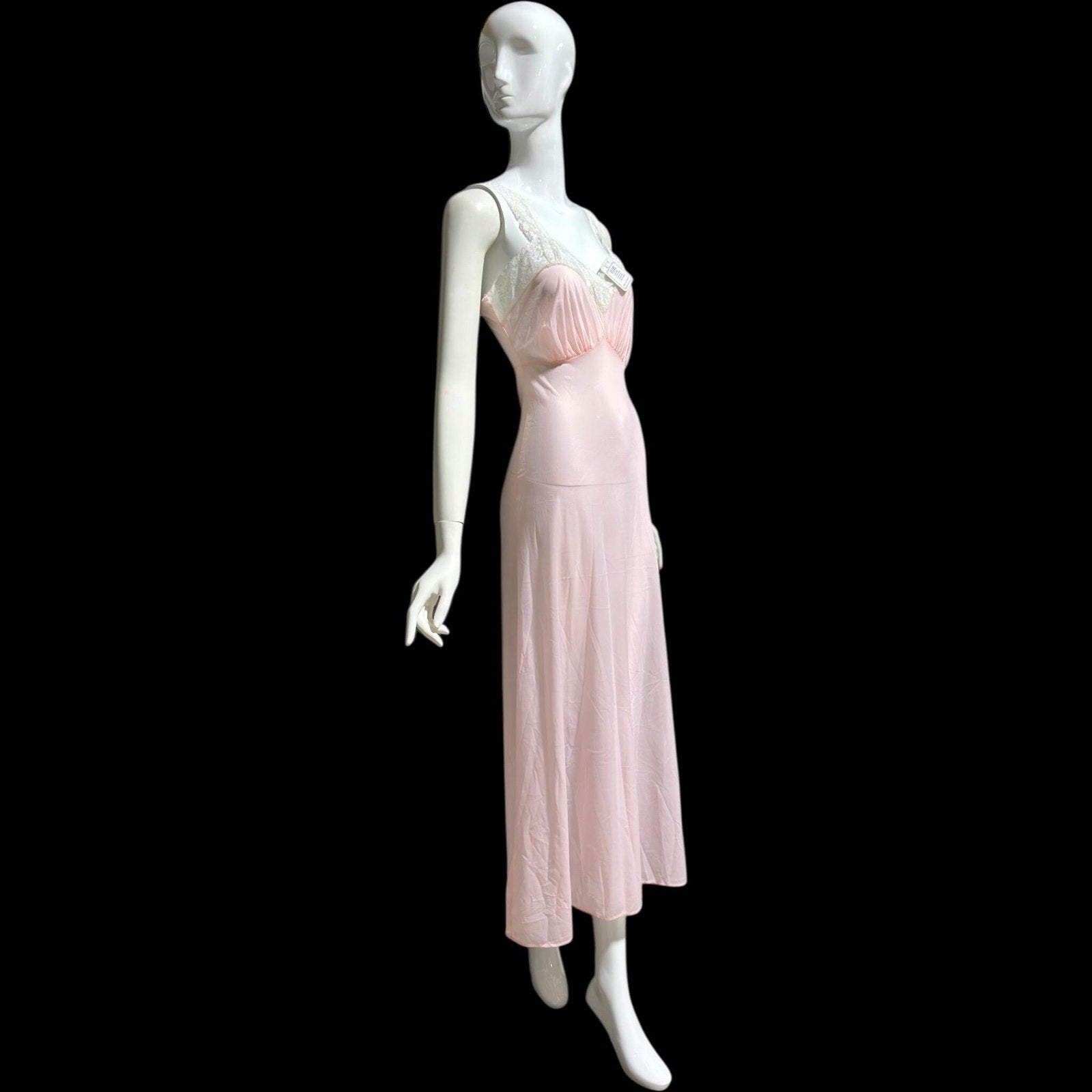 Subtly sheer petal pink nylon. Notice the mannequins red measurements showing through the gown.