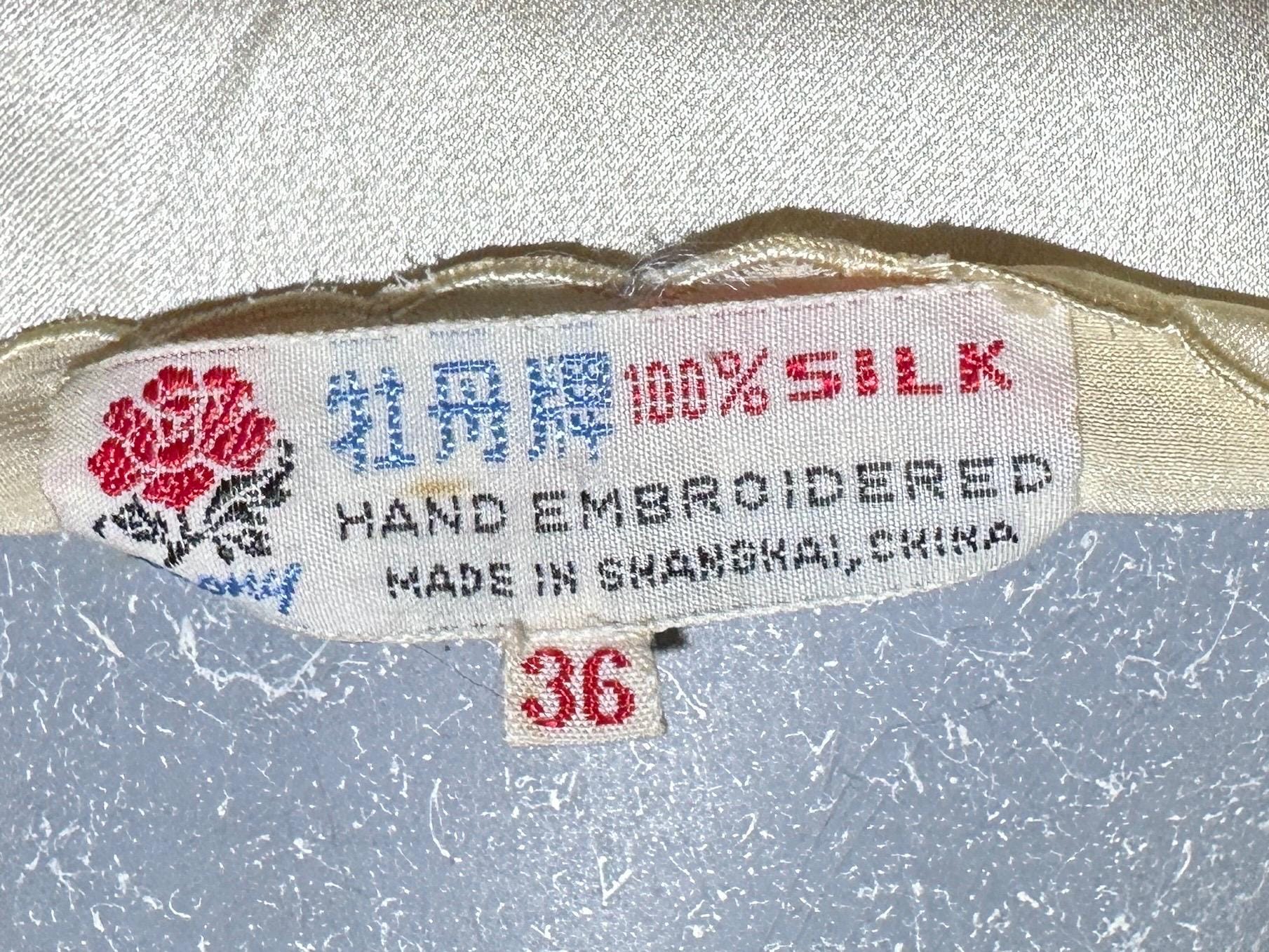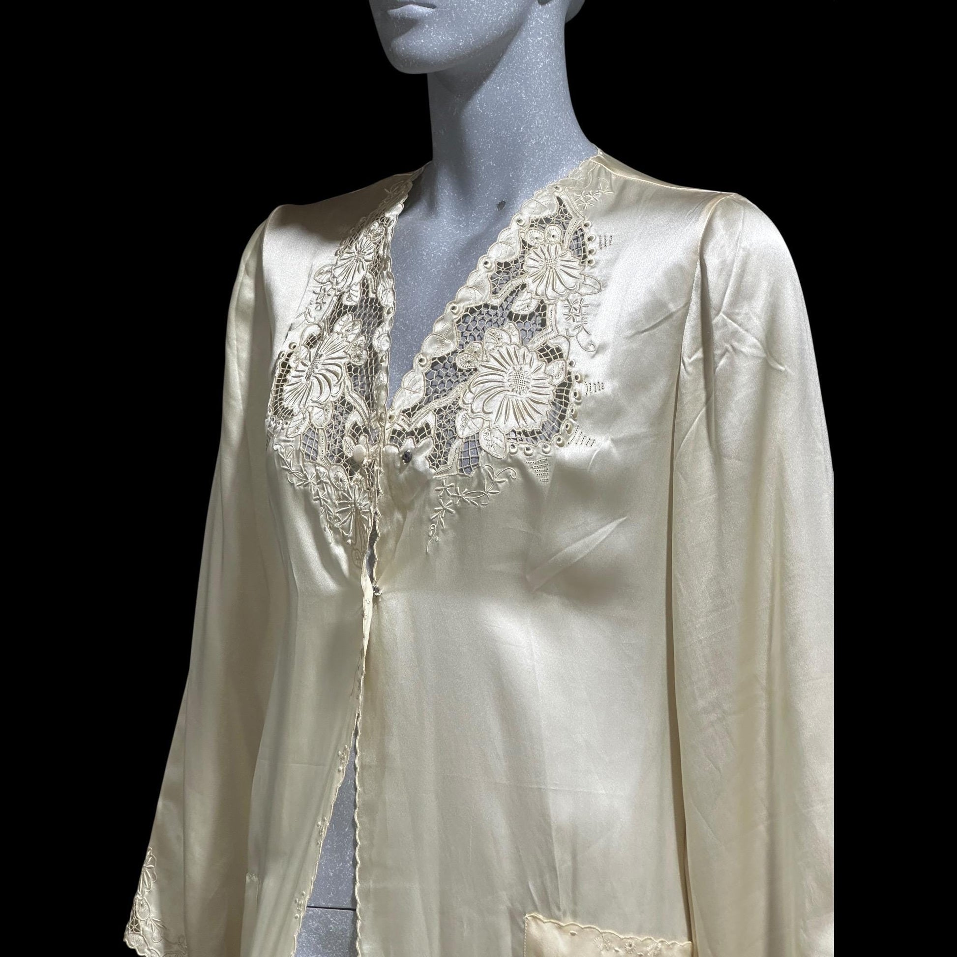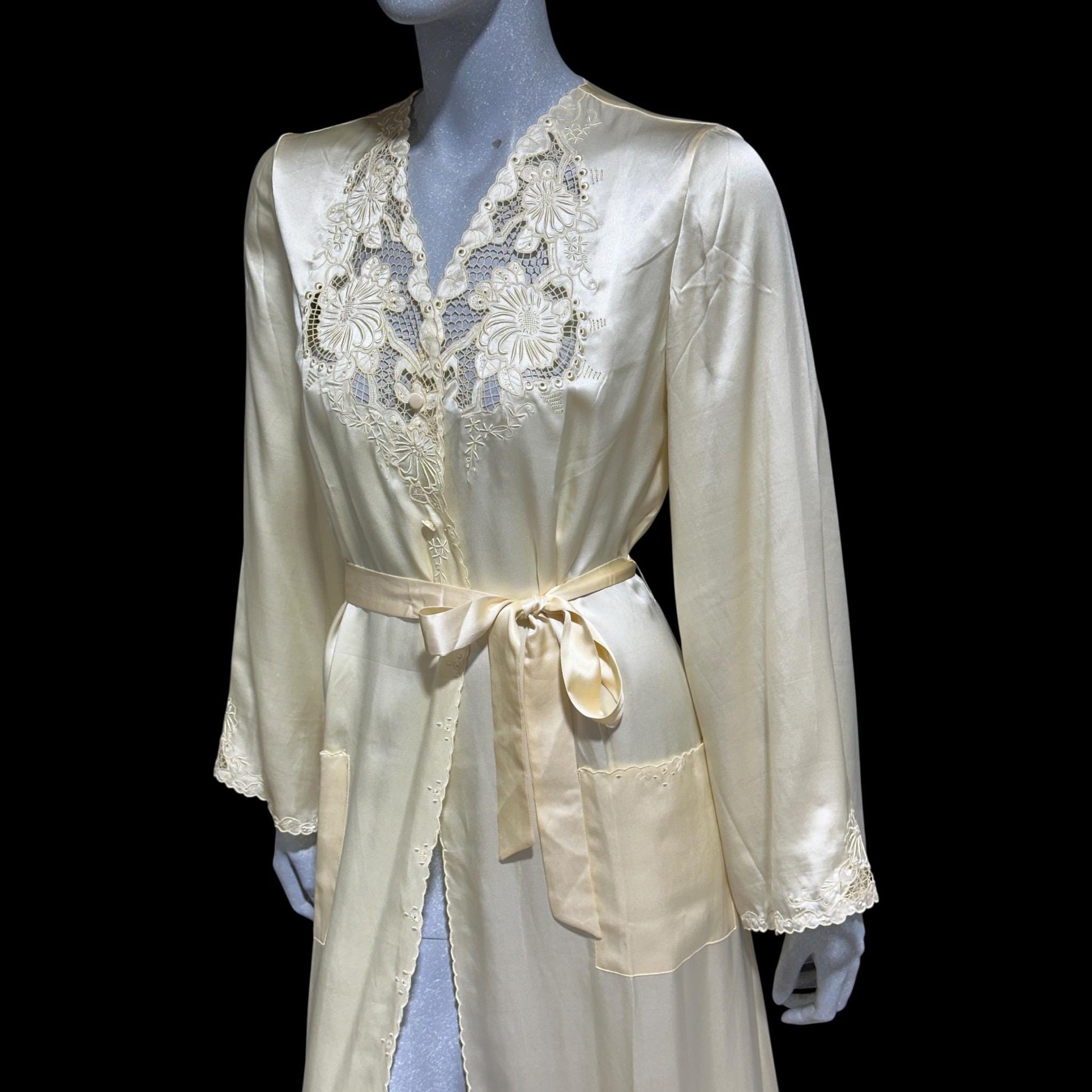 PEONY vintage 1950s dressing gown robe, 100% silk creamy white embroidered robe house coat