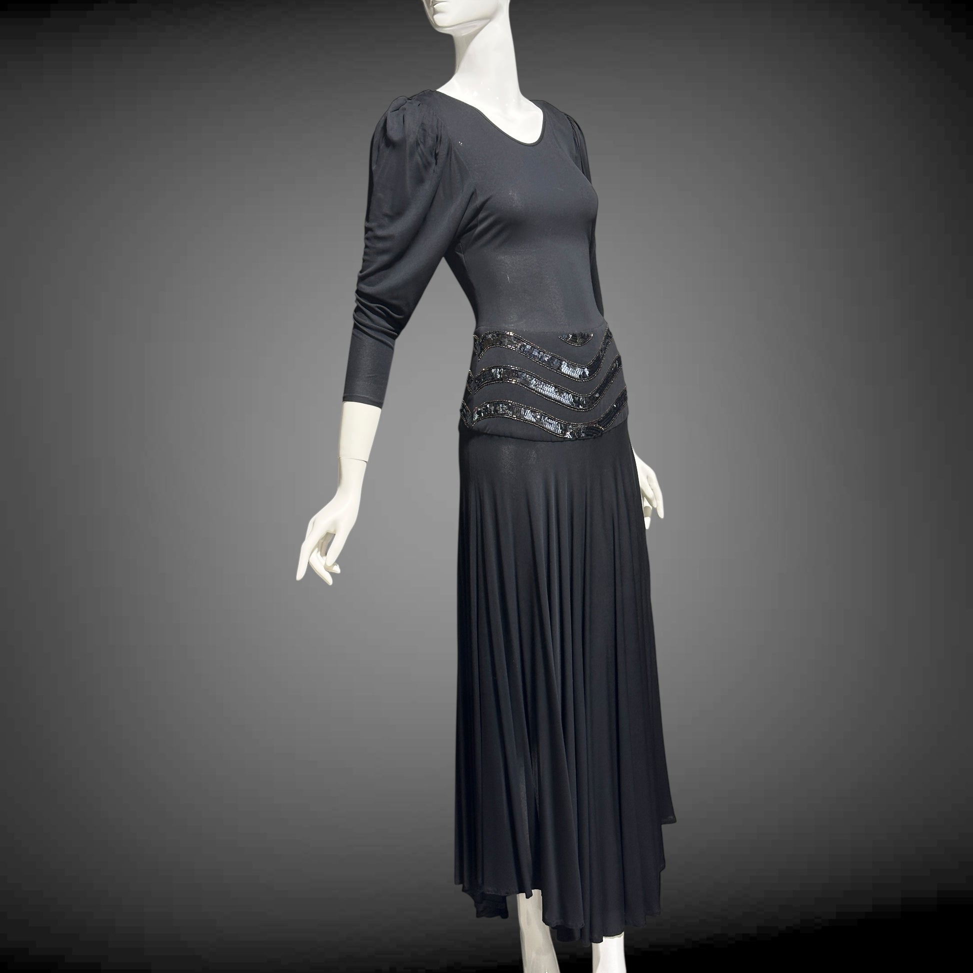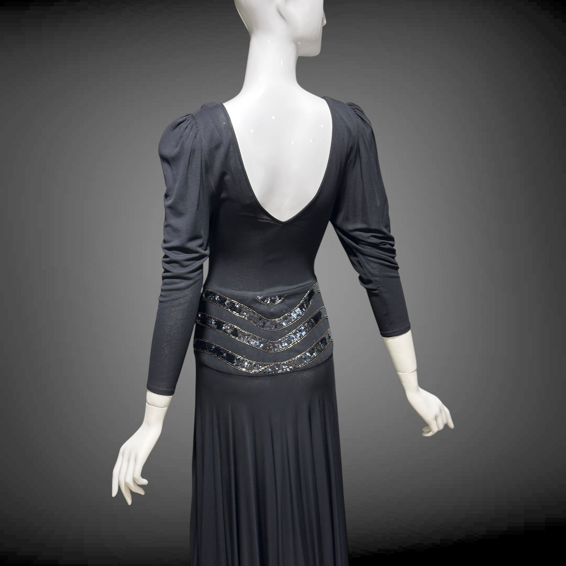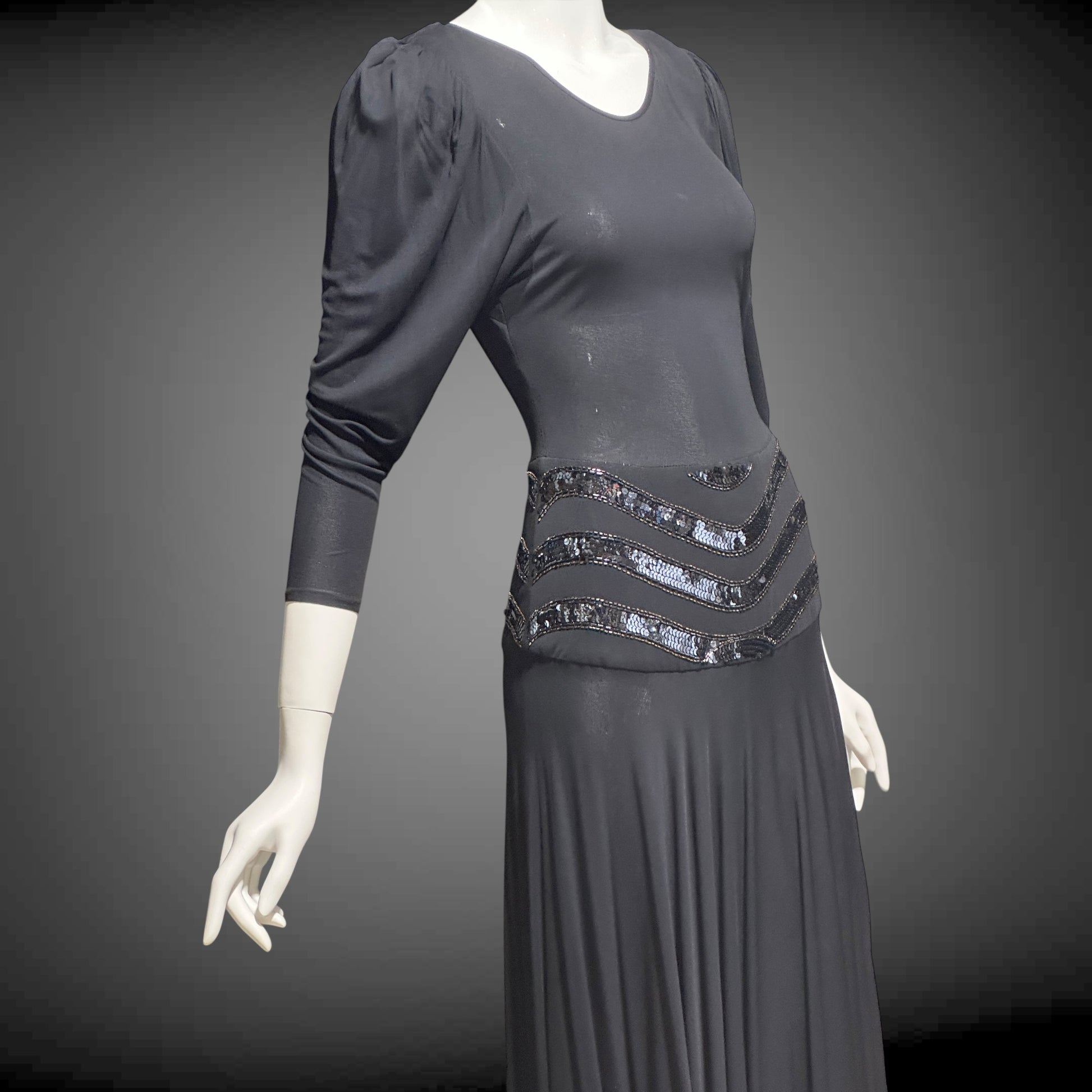 SAKS FIFTH AVENUE Made in England, 1970s evening dress, black jersey knit and sequins