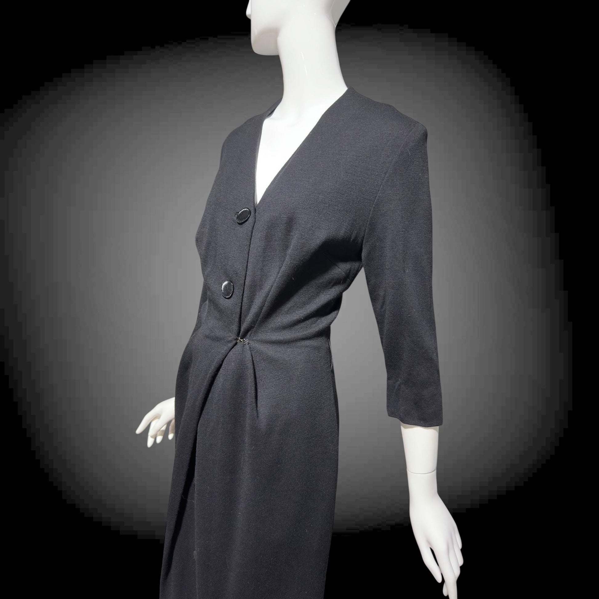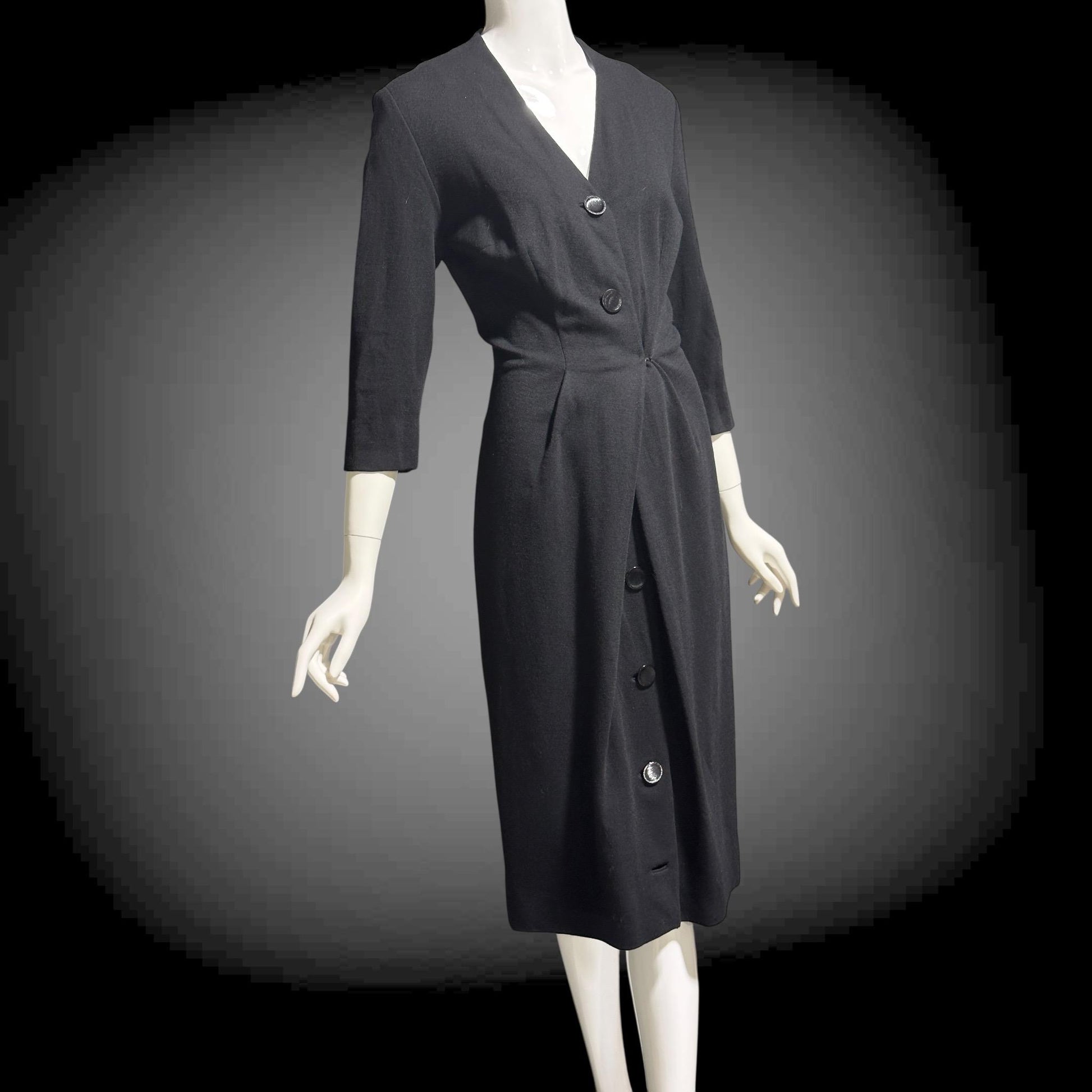TRICOSA PARIS vintage 1950s coat dress, black knit bombshell wiggle dress, button front