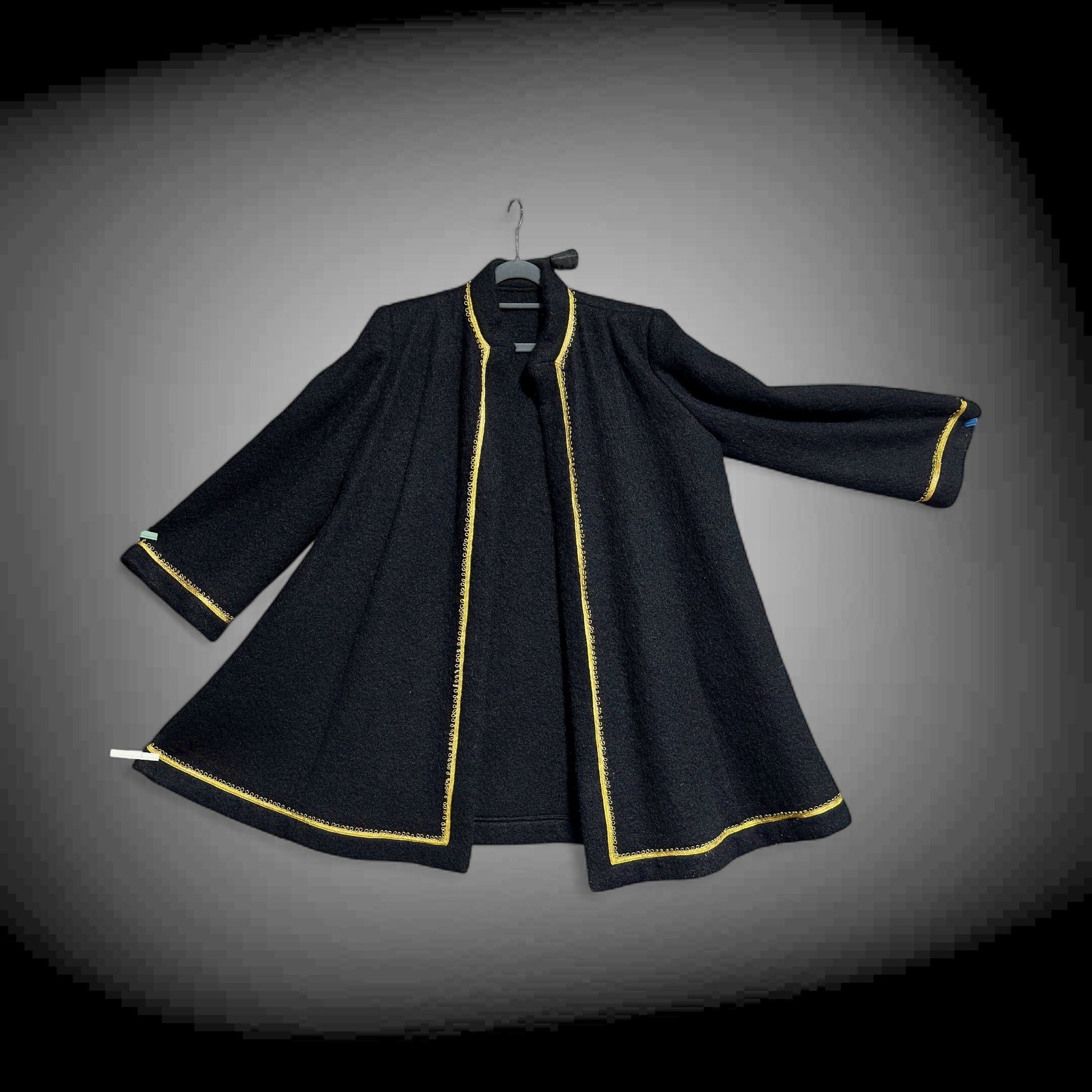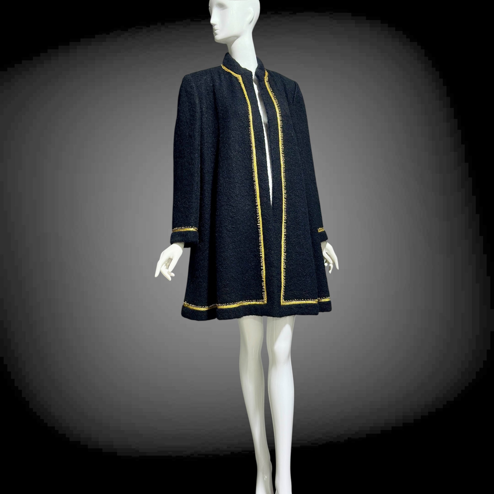 Amazing lightweight swing coat made of soft mohair and trimmed in fun gold metallic cord.