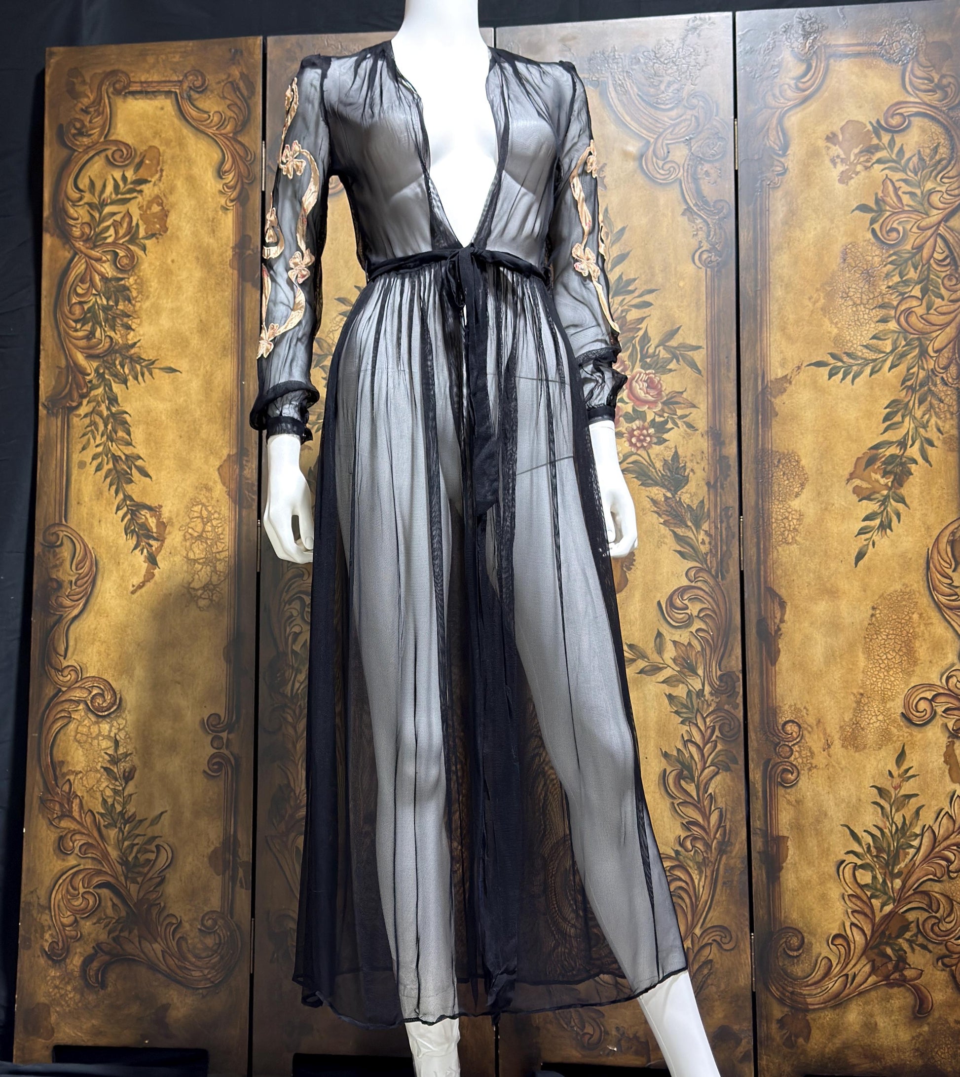 1930s Vintage dressing gown robe, Sheer black mesh lingerie housecoat
