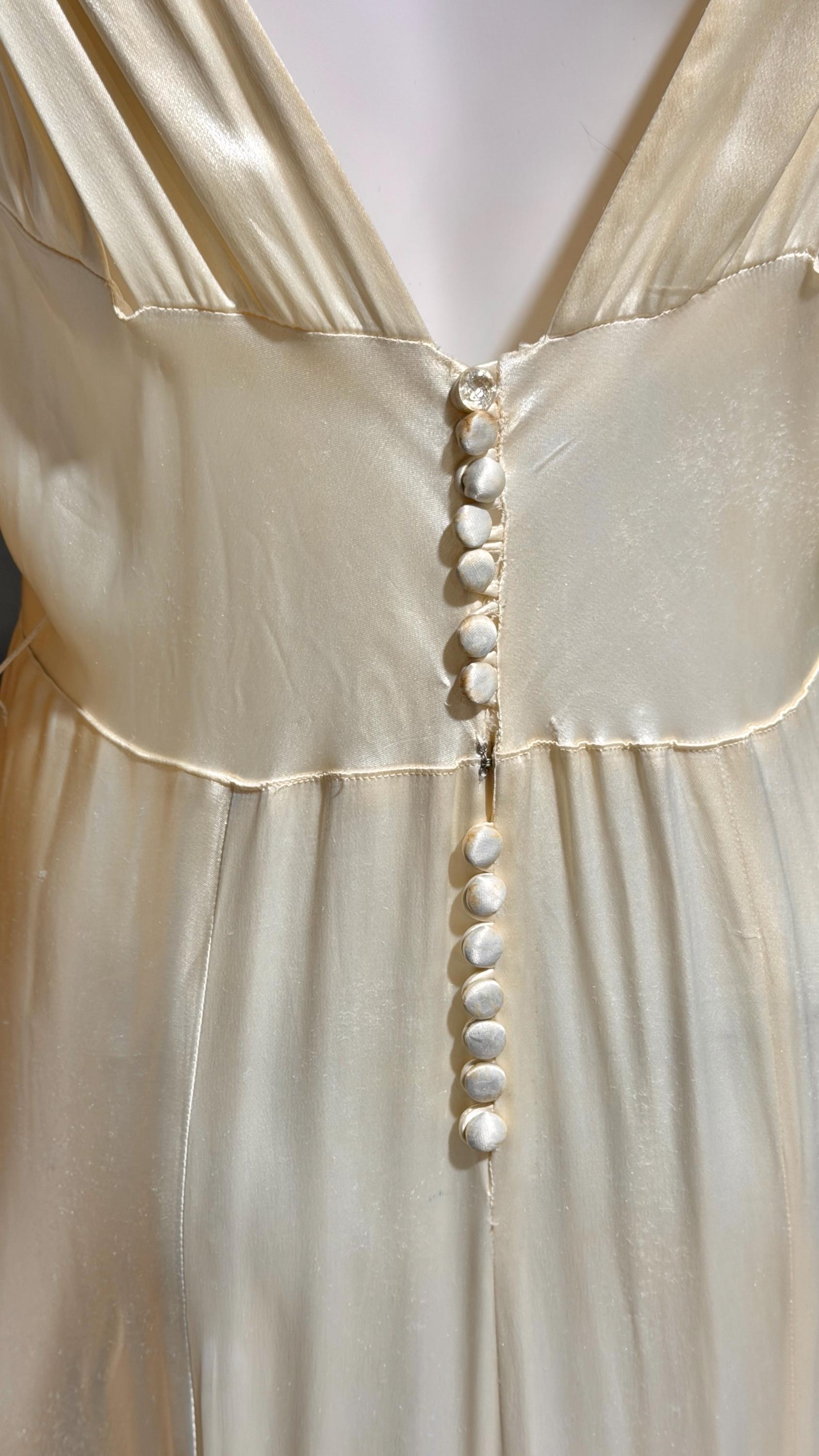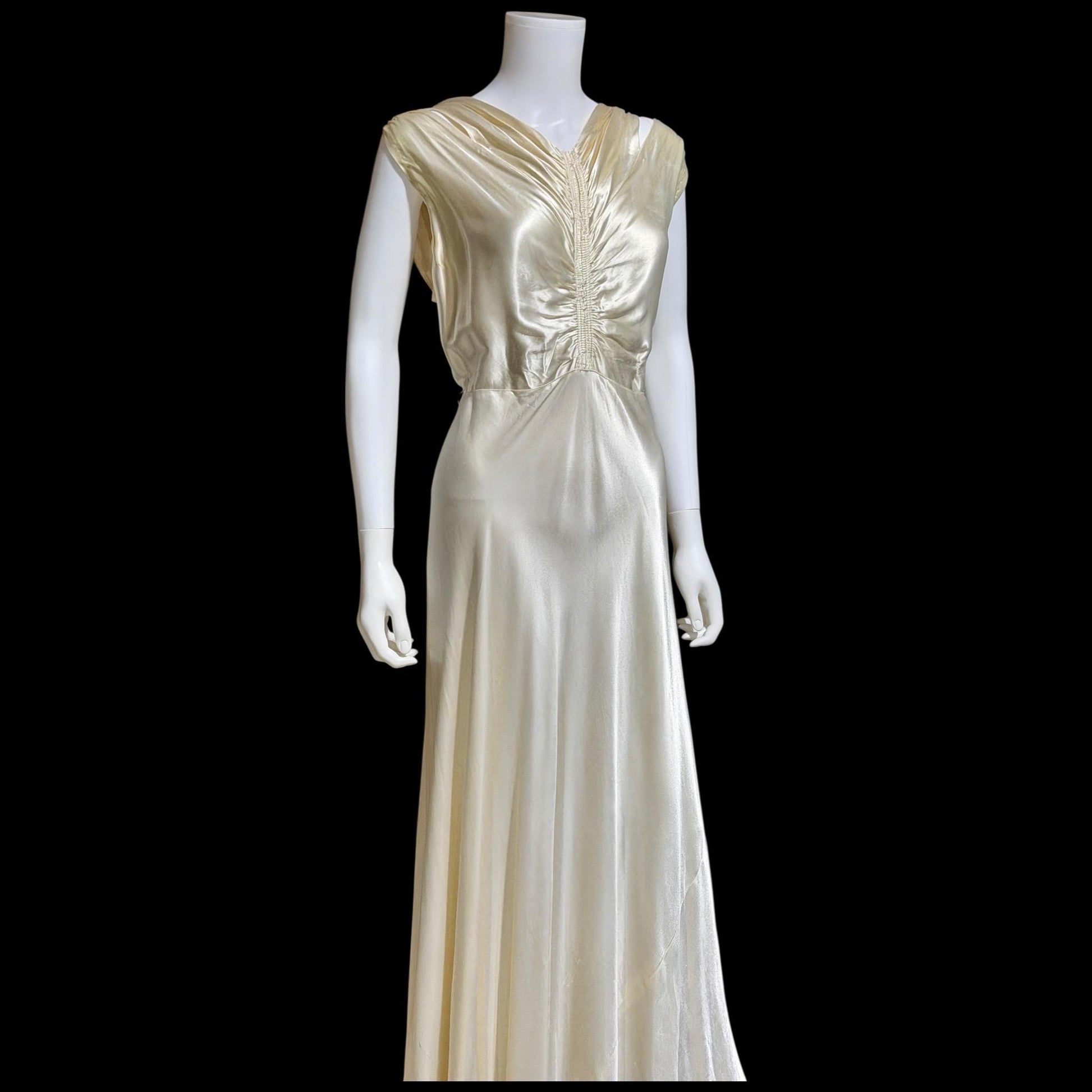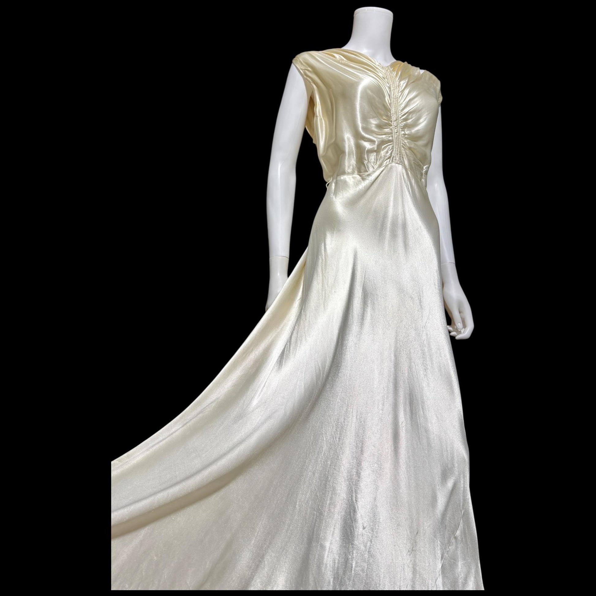 1930s vintage wedding dress, shimmering pearly vanilla liquid satin sheath gown, medium