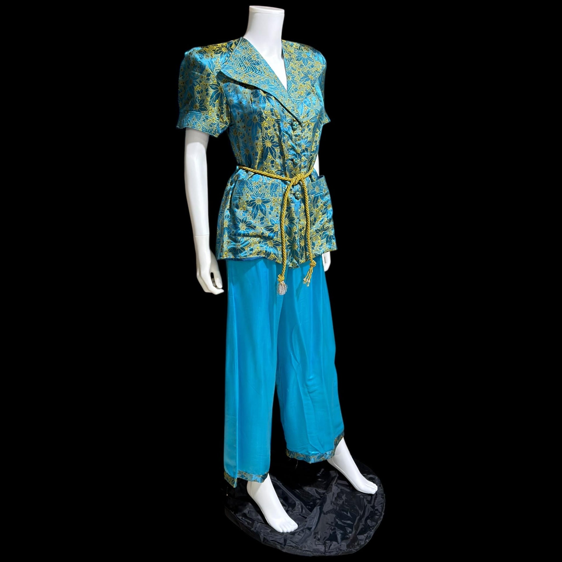 1940s vintage silk pajamas, 2 piece cocktail party lounge set, Blue Gold floral silk damask