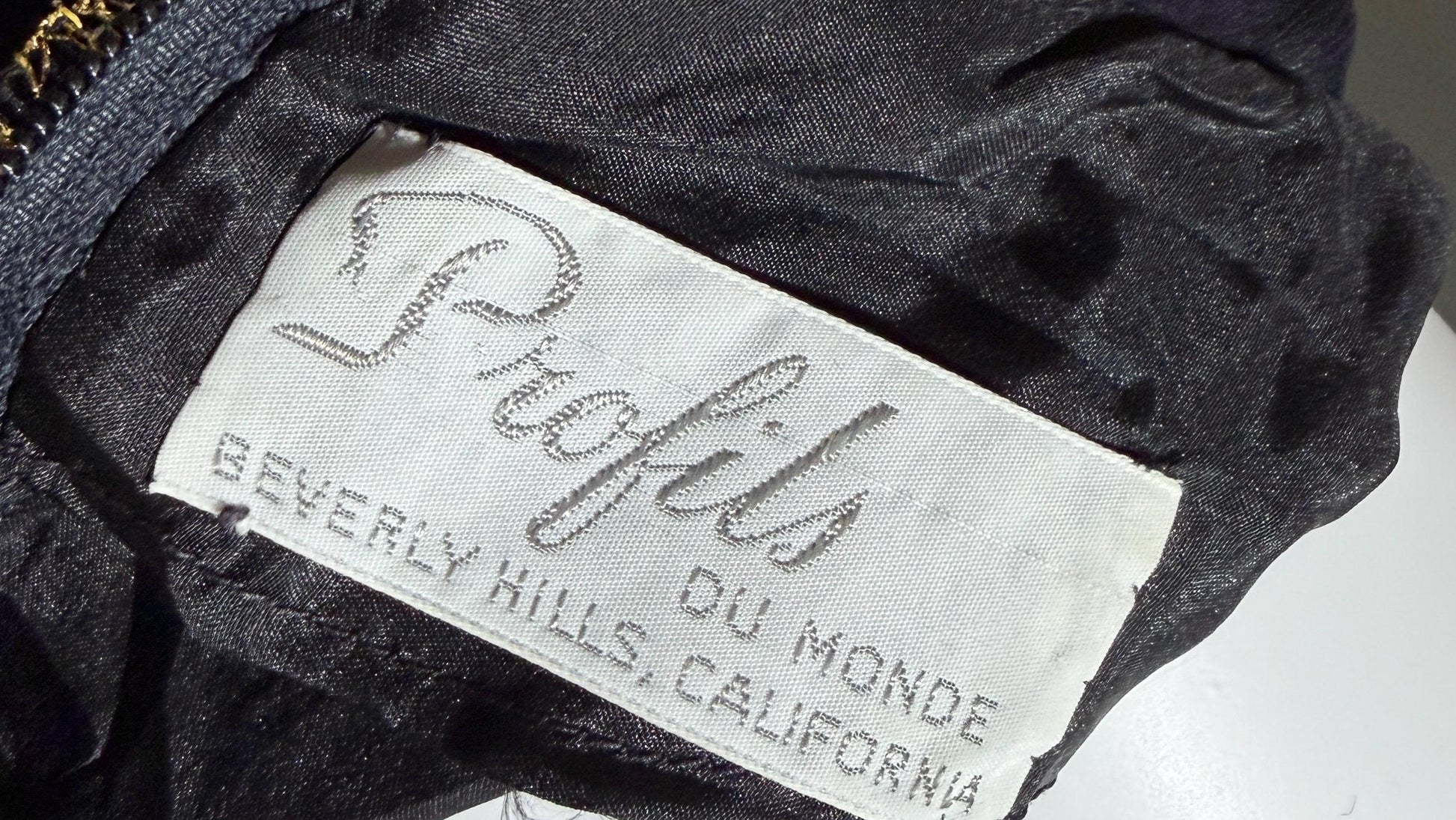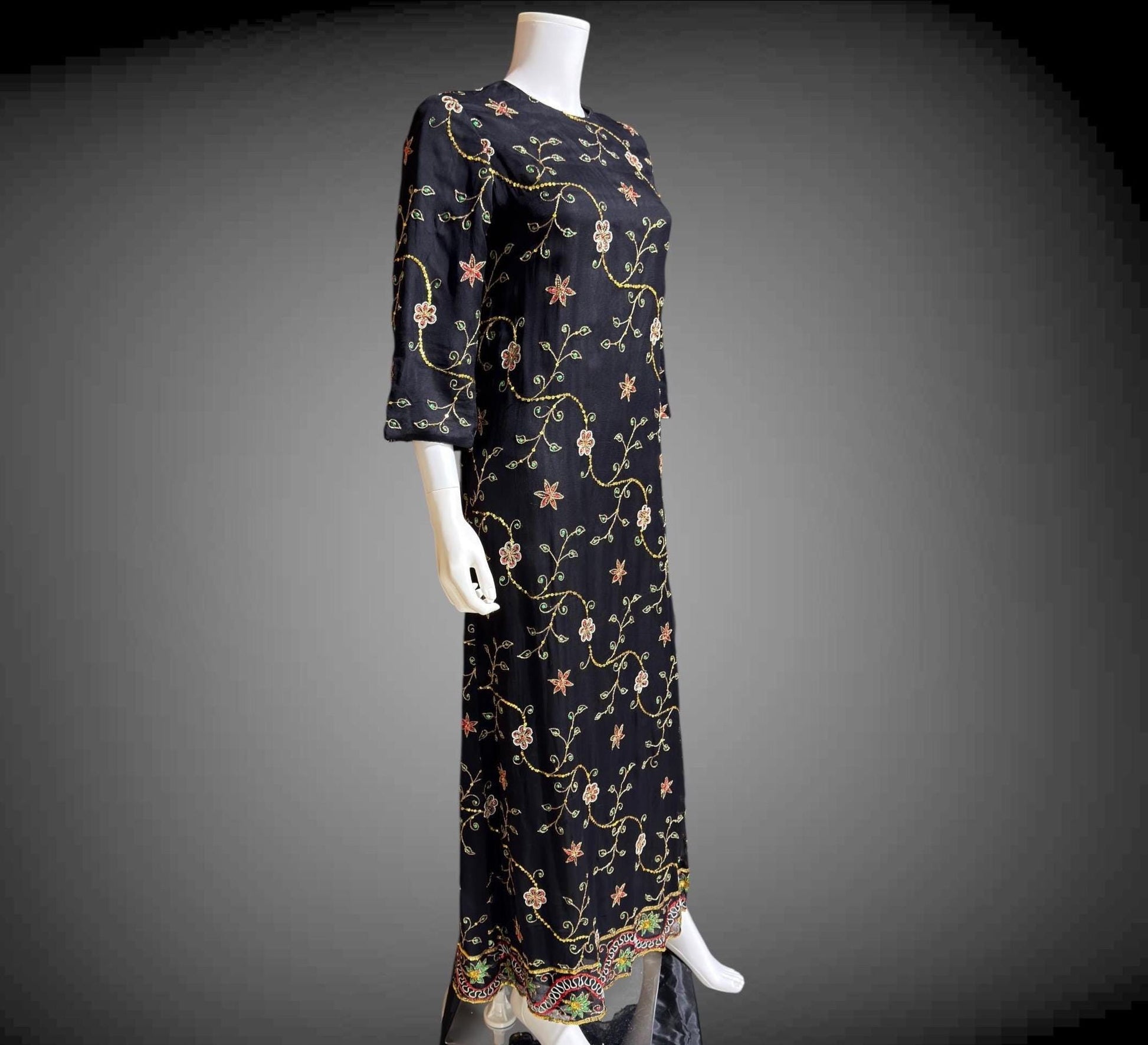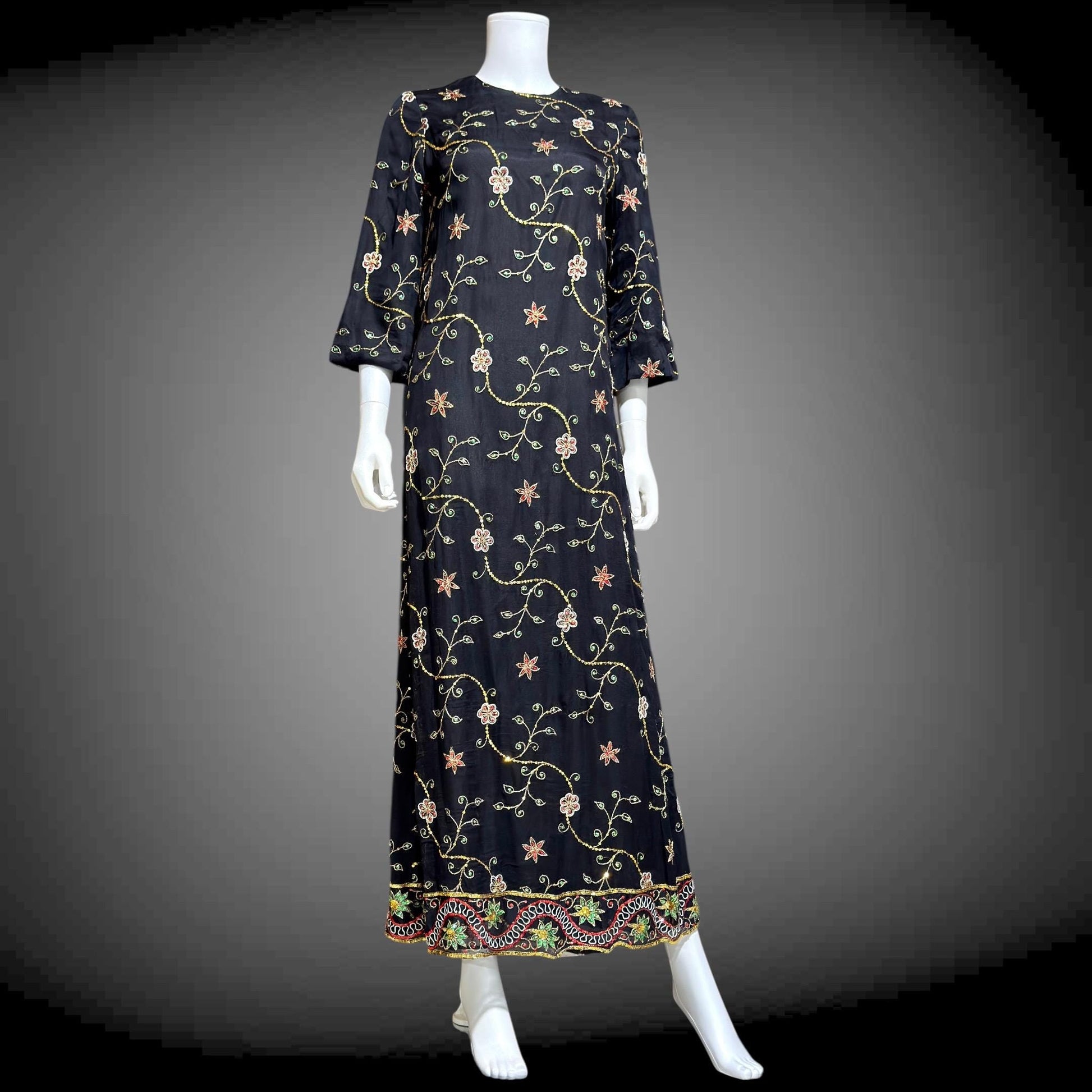 PROFILS du MONDE vintage 1960s caftan dress, Beverly Hills Designer Black Silk embroidered sequin kaftan evening dress