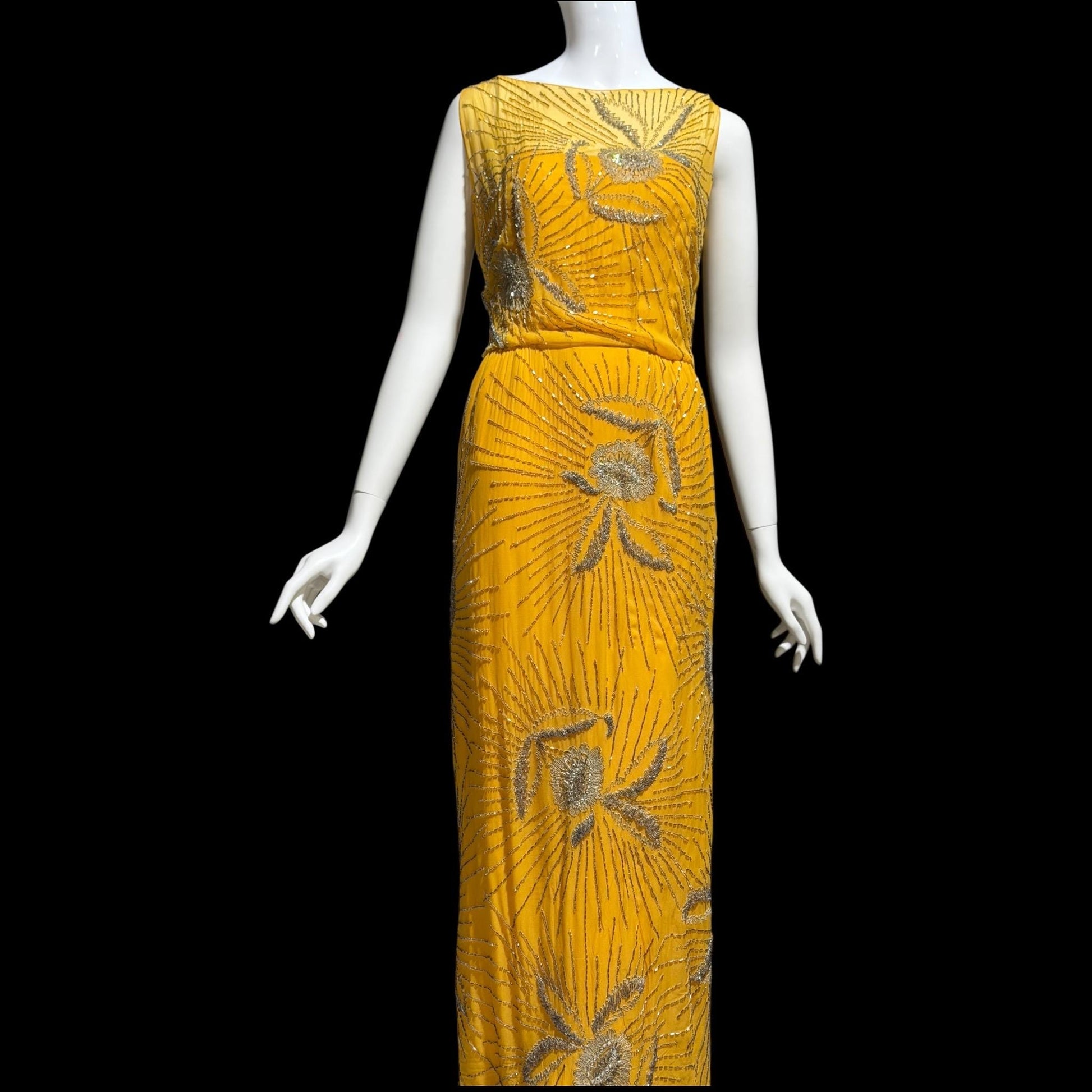 1960s vintage evening dress gown, Custom Made Marigold silk beaded Sheath Gown