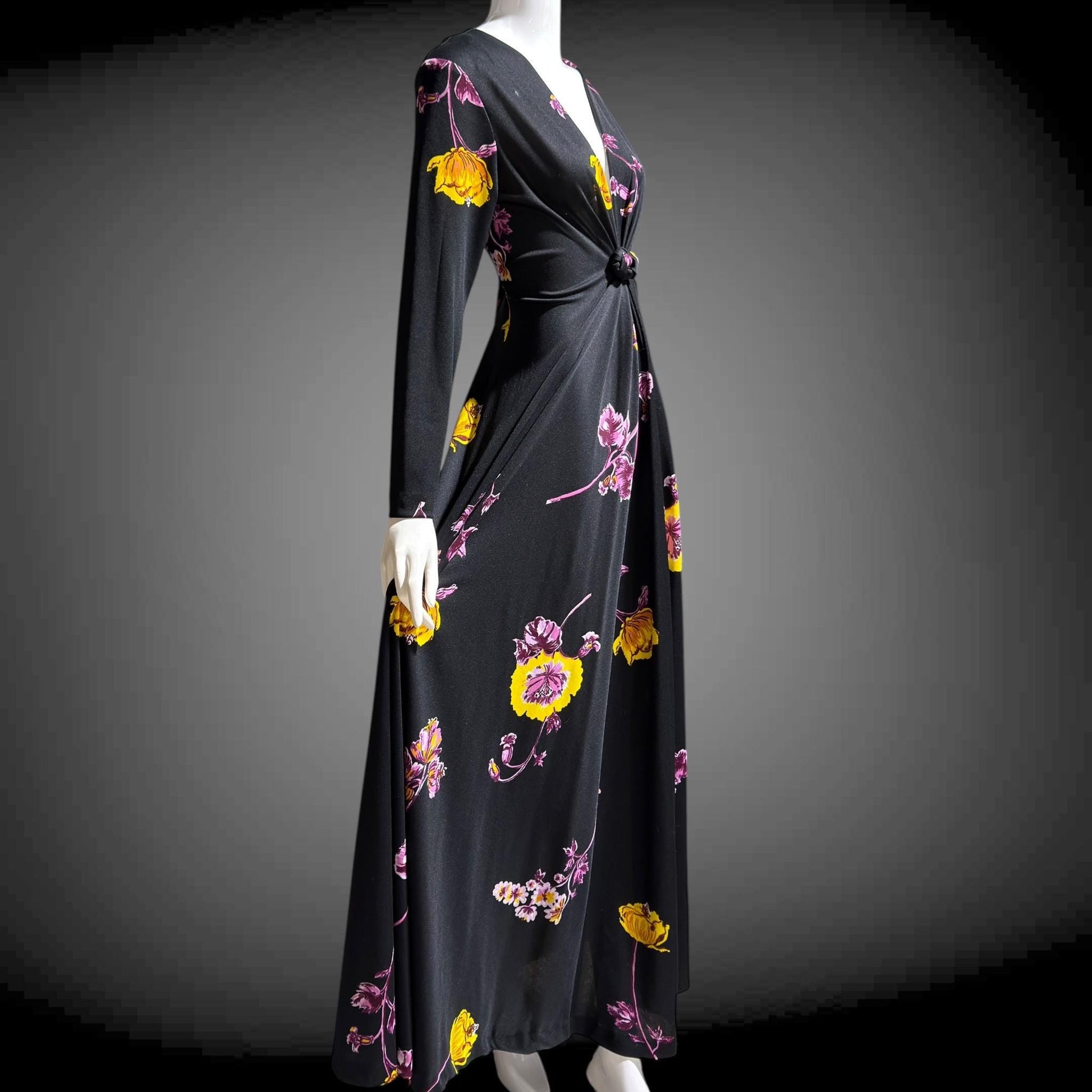 DON LUIS de espana vintage 1970s Maxi Dress, plunging V black floral jersey knit dress, stretchy