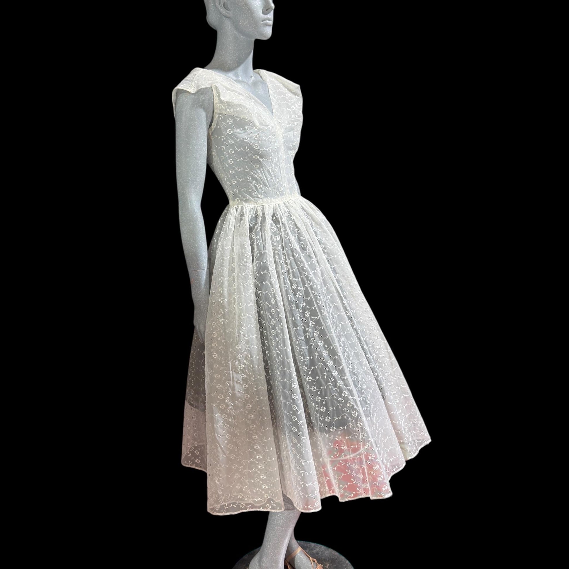 1940s Sheer white fit flare ballet midi length gown