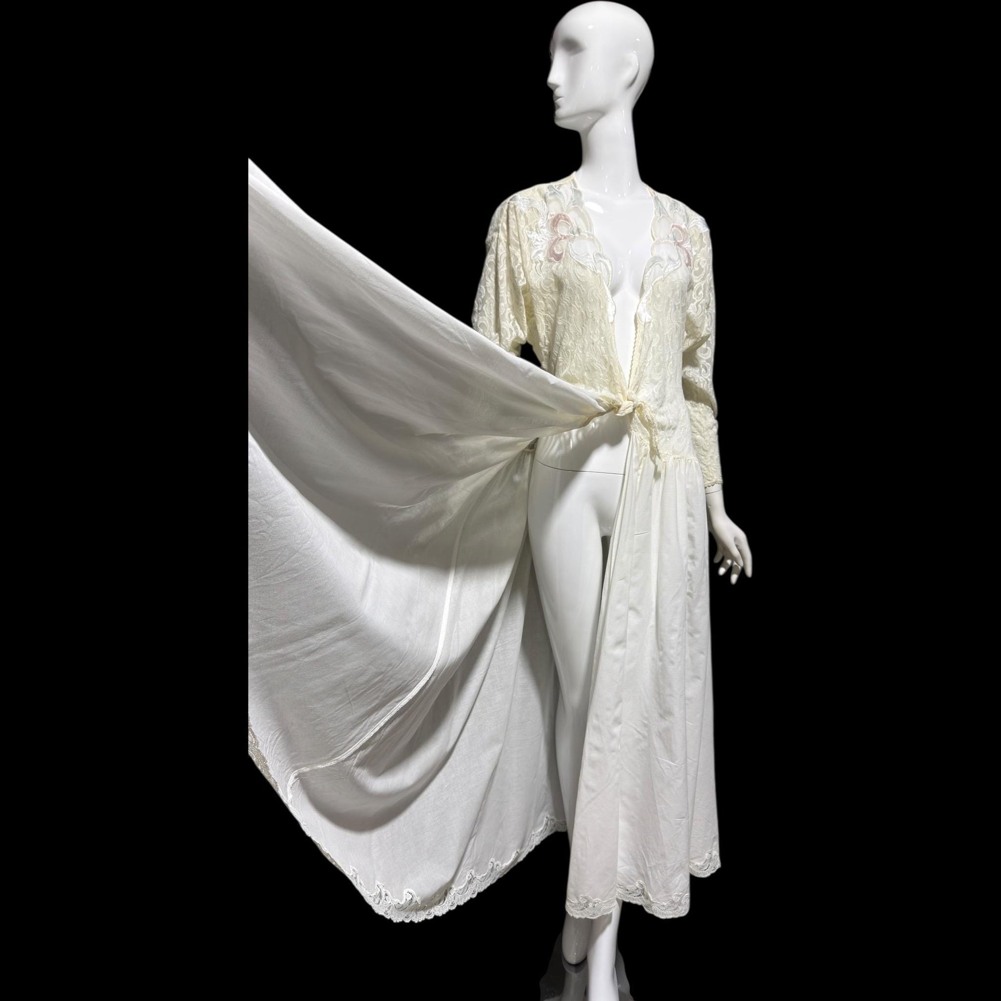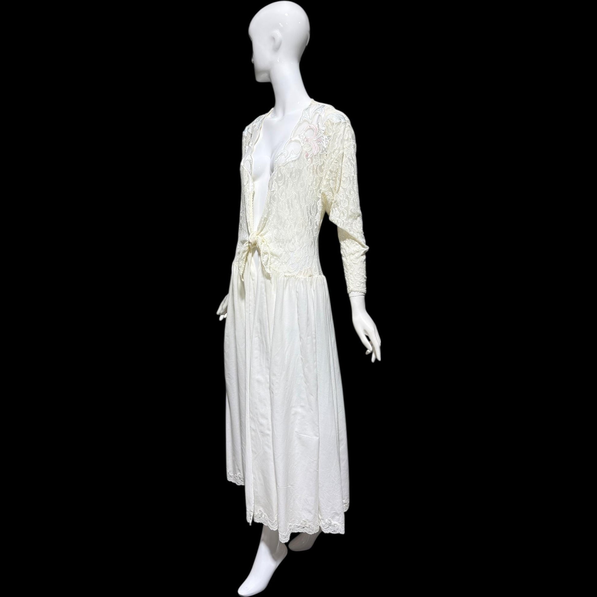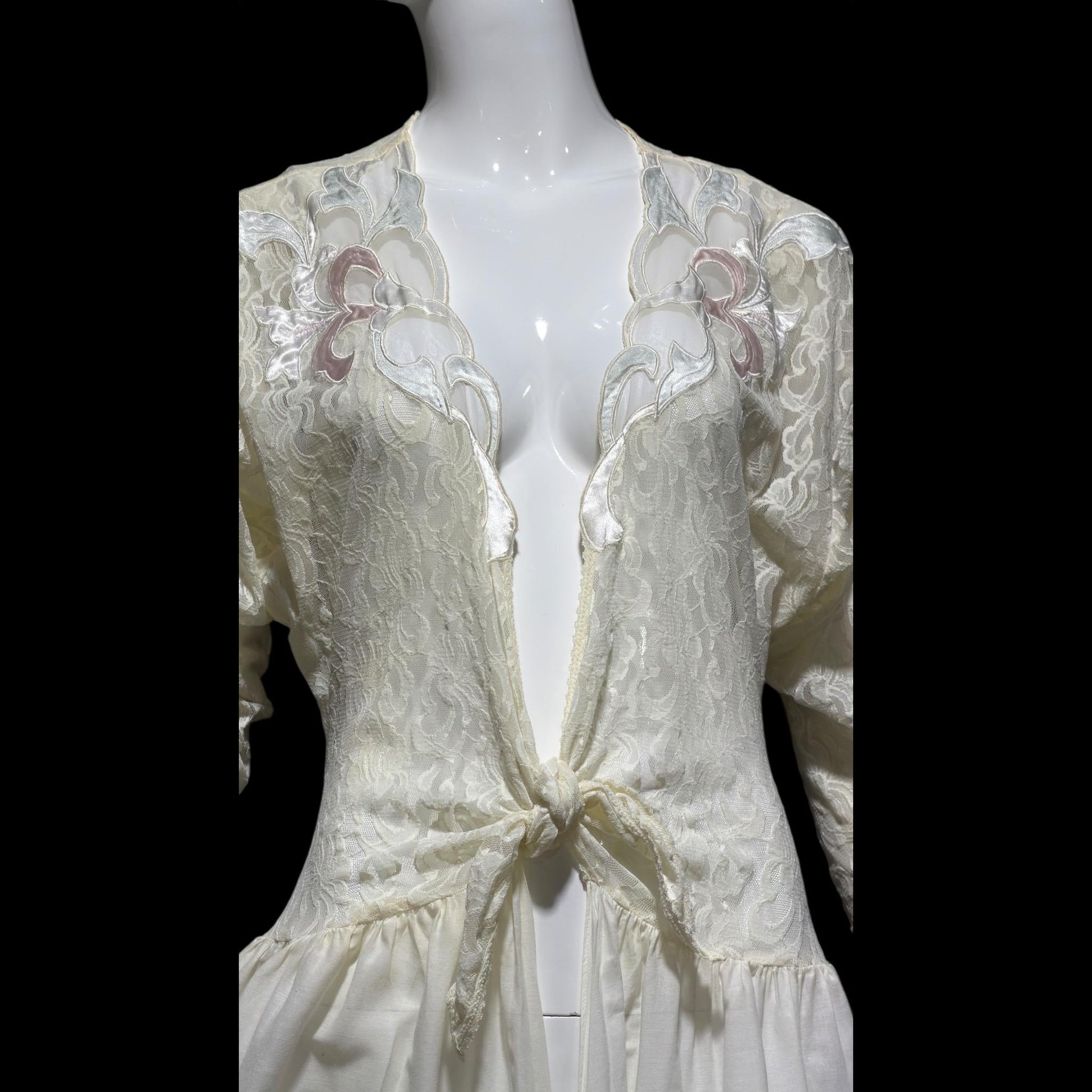 NATORI Saks, vintage dressing gown robe, 1980s Sheer white lace tie front house coat