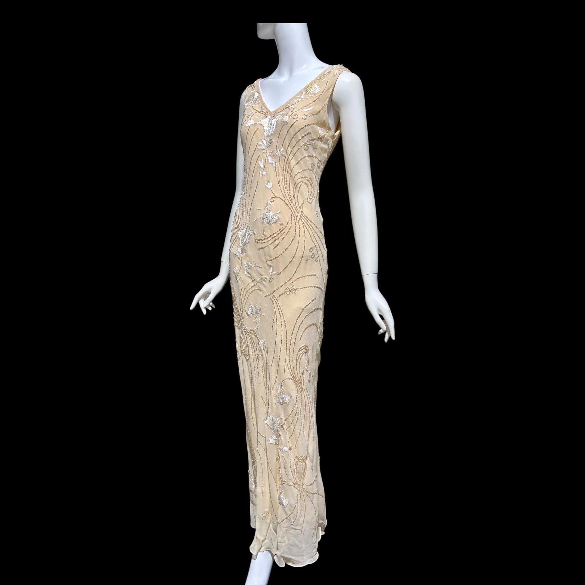 LILLIE RUBIN vintage evening dress gown, 1990s Nude Beaded Silk slip dress