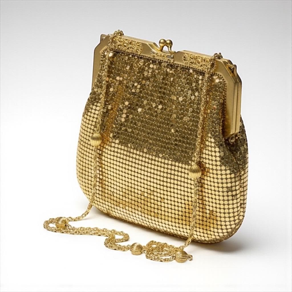 WHITING & DAVIS vintage 1960s mesh bag purse, gold mesh dance evening bag